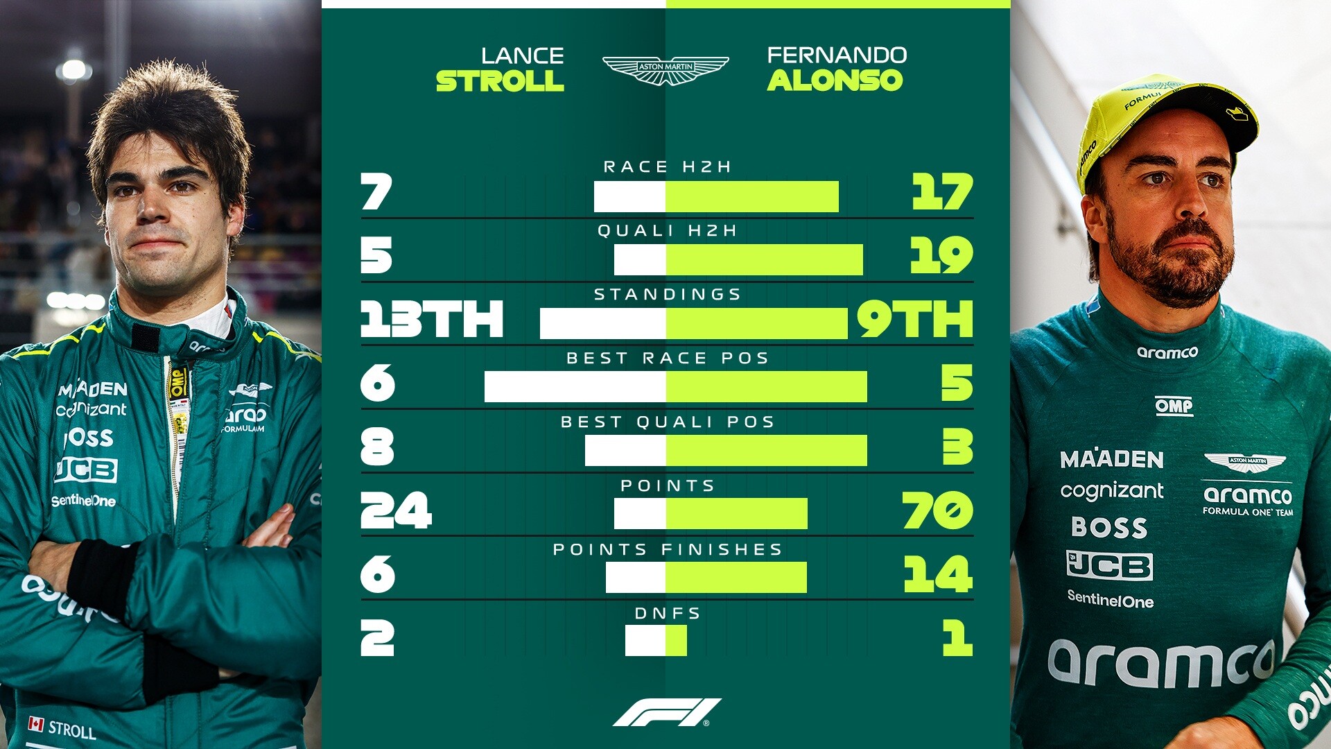 アストンマーティンのランス・ストロールとフェルナンド・アロンソの2024年F1の成績比較。