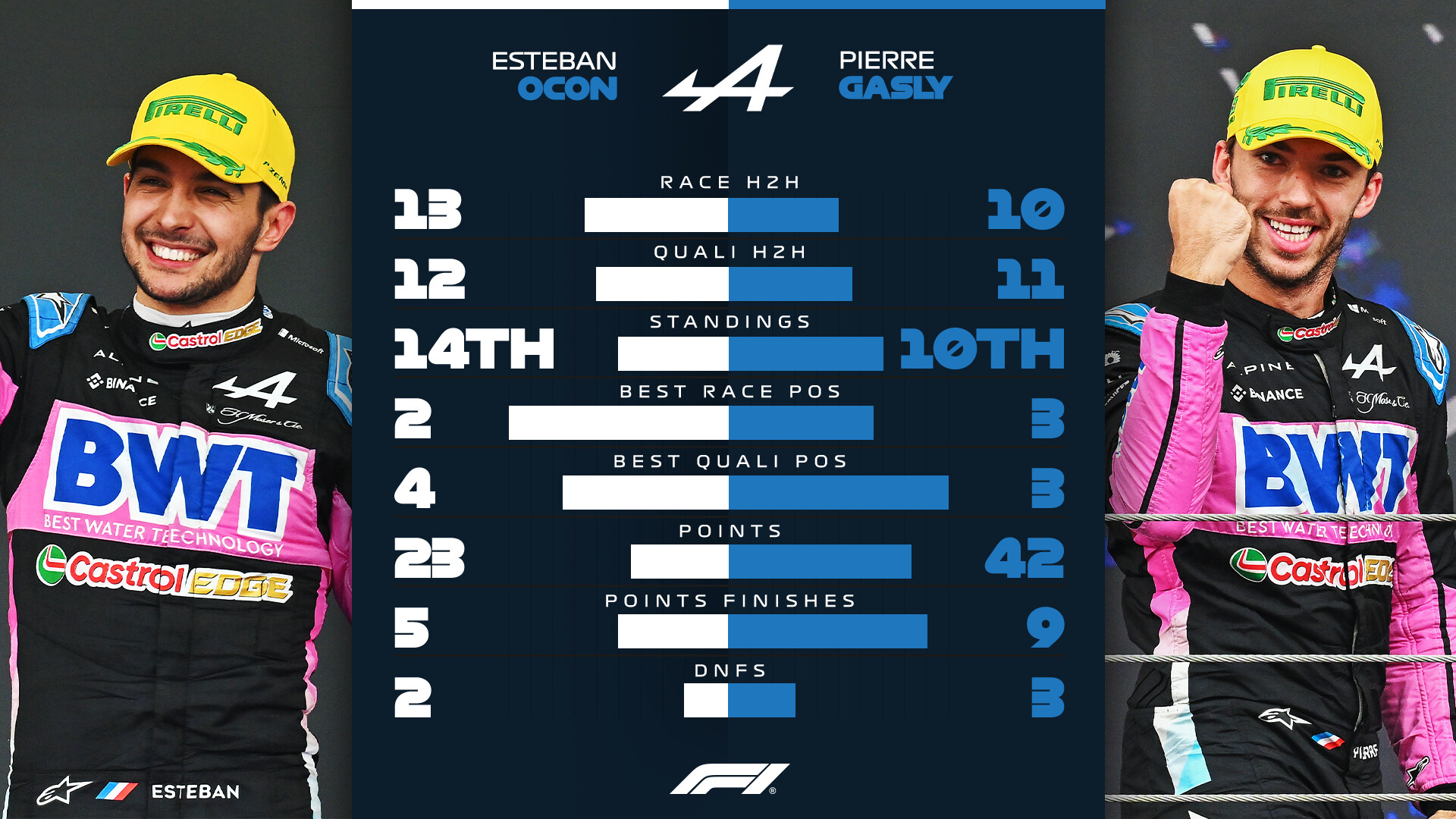 アルピーヌのエステバン・オコンとピエール・ガスリーの2024年F1の成績比較。
