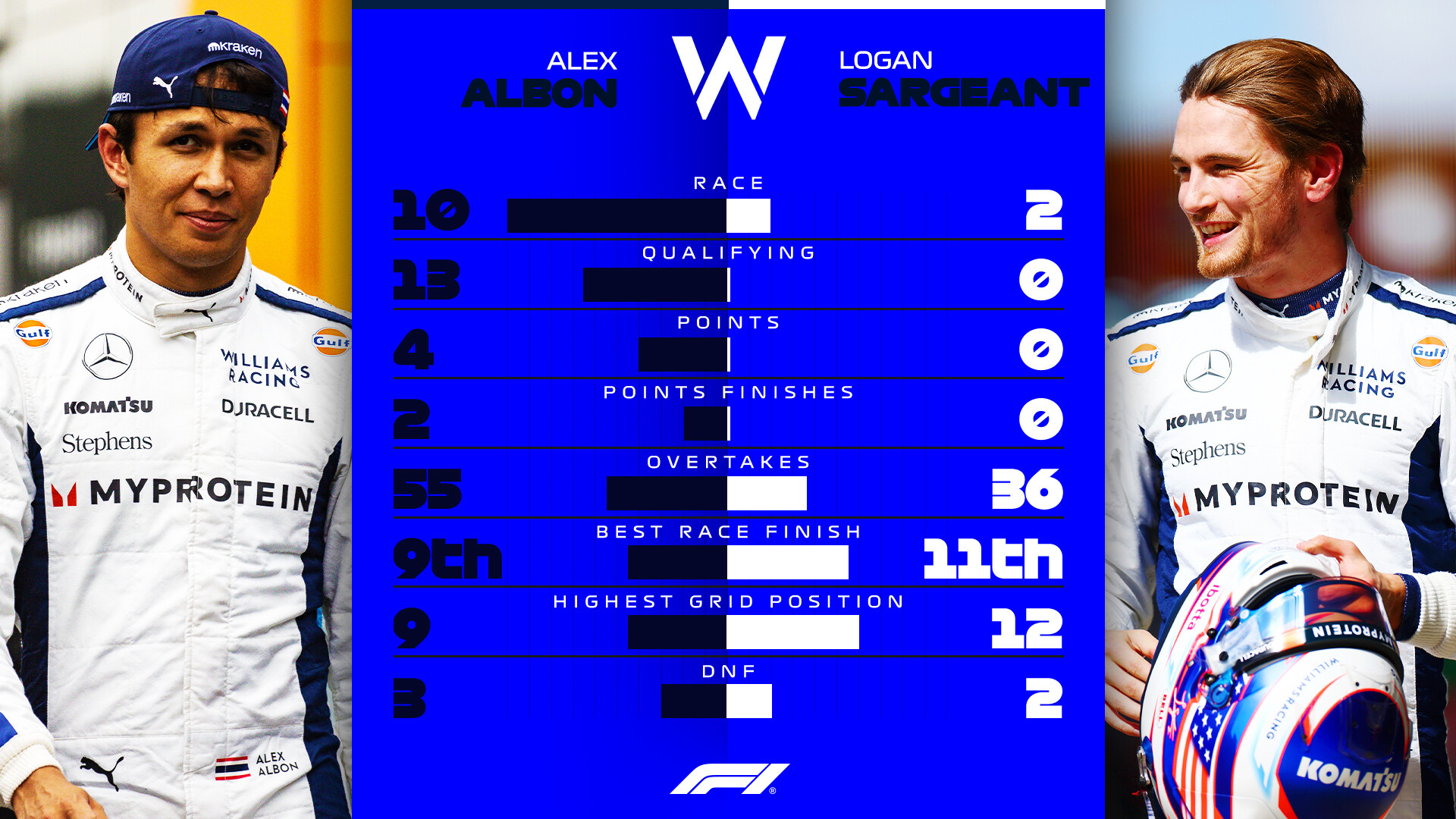 ウィリアムズのアレックス・アルボンとローガン・サージェントの2024年F1の前半成績比較。