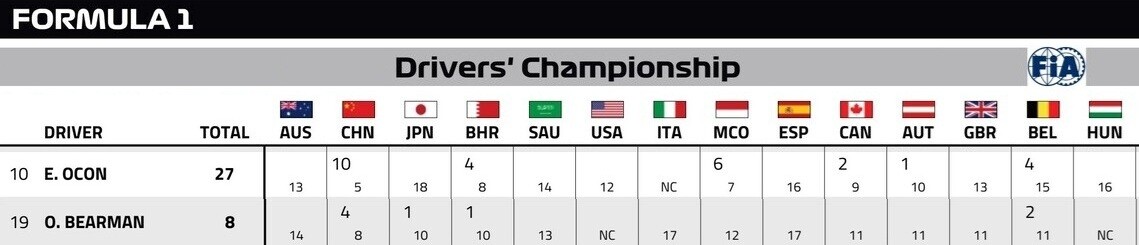 ハースのエステバン・オコンとオリバー・ベアマンの2025年F1の前半成績比較。