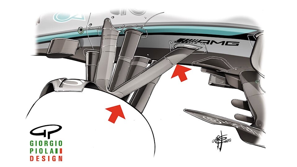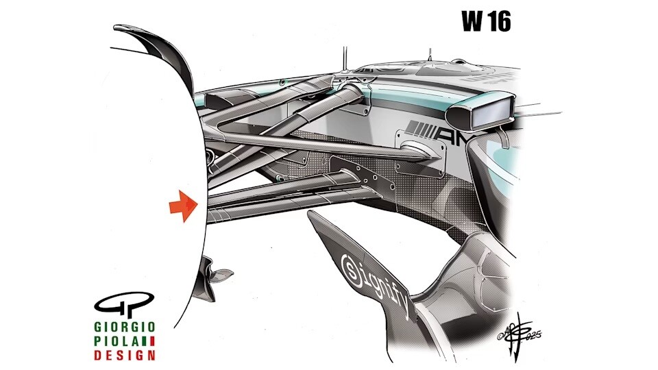 マクラーレンMCL39と比較すると、メルセデスW16は、リア上部ウィッシュボーンとトンネルの吸気口の間の距離を大きくして、妨げのない気流を実現しようとする、より従来的で異なるアプローチを採用している。ただし、マクラーレンと同様に、メルセデスはトラックロッドの位置をフロントウィッシュボーンの後ろに変更した (赤い矢印)。