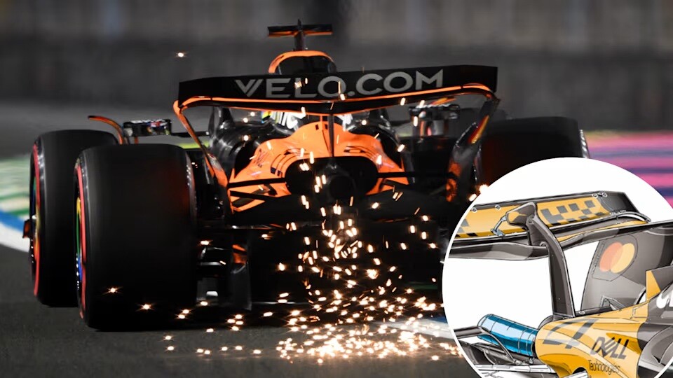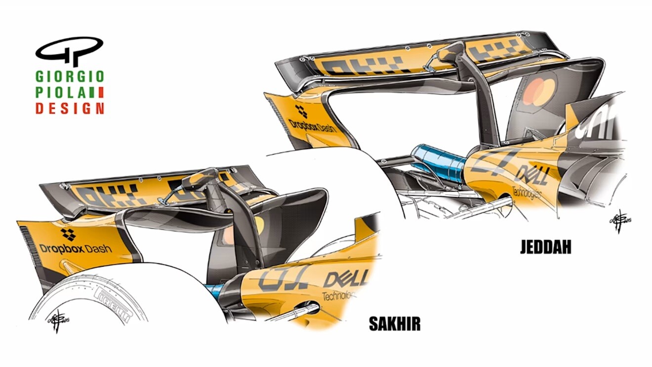 マクラーレンMCL39:マクラーレンはバーレーンでは、おそらく上位4チームの中で最もダウンフォースの高いウイングセットアップを採用したのだろう。次のサウジアラビアでは、主翼(メインプレーン)面積と下面面積が大幅に減少したものの、フラップ面積と角度は他の3チームよりも大きくなっていた。