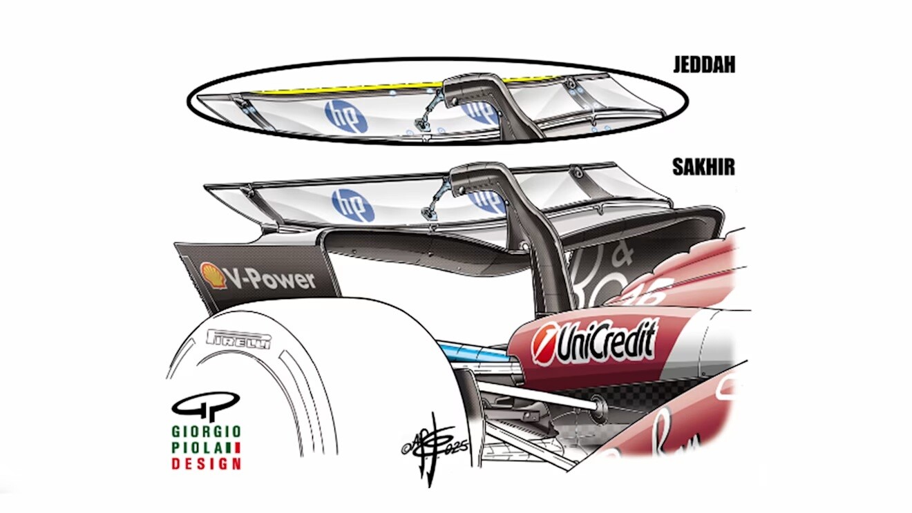 フェラーリSF-25:フェラーリはバーレーンでマクラーレンと非常によく似た、比較的ダウンフォースの高いウィングを使用した。主翼下面の面積は大きく、フラップ角度は低めだった。サウジアラビアでは、基本的にバーレーンのウィングのフラップを小さくしたタイプを使用した。主翼面積はメルセデスと同程度だったが、ビームウィングの荷重は低めだった。