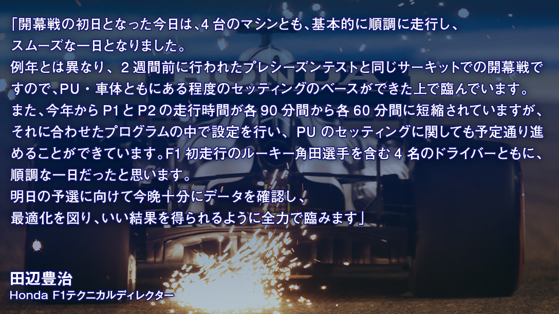 「例年とは異なり、2週間前に行われたプレシーズンテストと同じサーキットでの開幕戦ですので、パワーユニット・車体ともにある程度のセッティングのベースができた上で臨んでいます。また、今年から金曜日のフリー走行の走行時間が各90分間から各60分間に短縮されていますが、それに合わせたプログラムの中で設定を行い、パワーユニットのセッティングに関しても予定通り進めることができています。F1初走行のルーキー角田裕毅を含む4名のドライバーともに、順調な一日だったと思います」