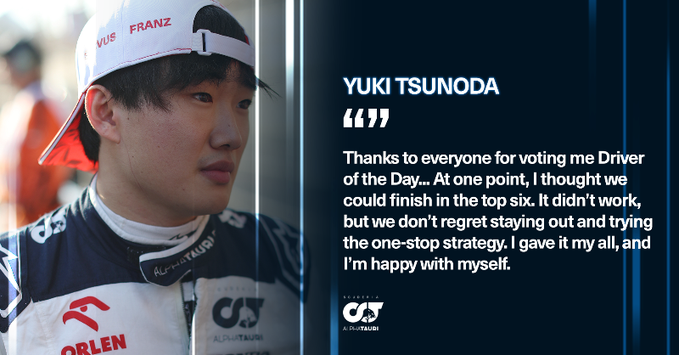 「ドライバー・オブ・ザ・デイに投票してくれた皆さん、ありがとう。タフなレースだった。一時はトップ6でフィニッシュできると思っていた。うまくいかなかったが、ワンストップ戦略を試したことは後悔していない。全力を尽くしたし、自分自身に満足している」