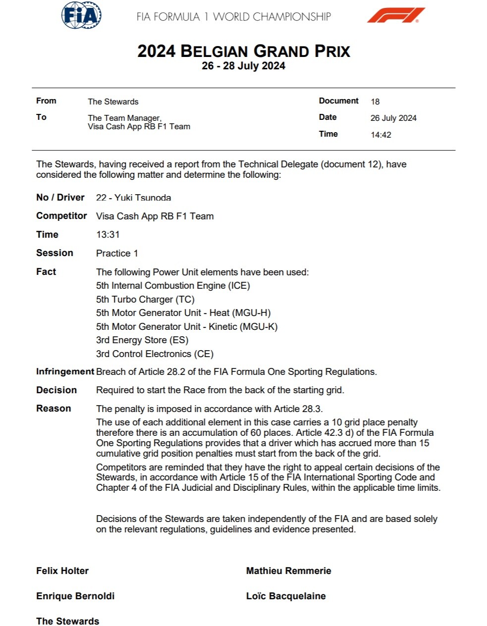 角田裕毅(RB)、規約数以外のパワーユニット使用によりベルギーGPでグリッド降格ペナルティを受け、最後尾からレースをスタートする。