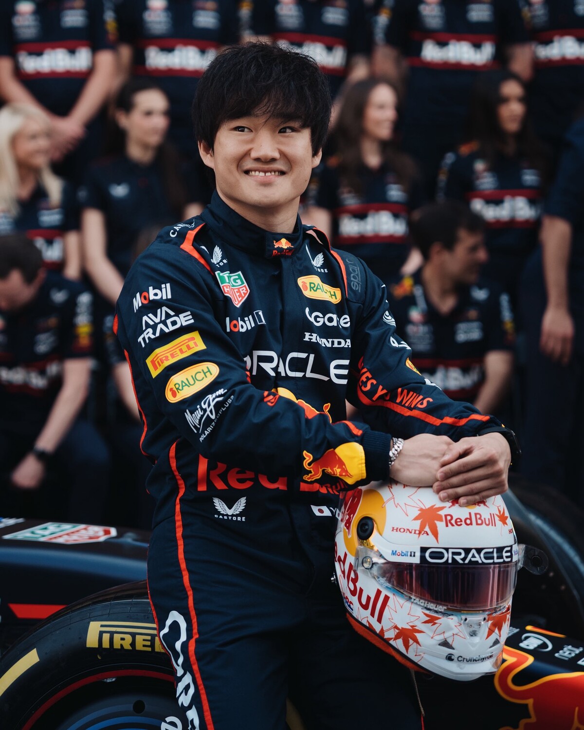 レッドブルの集合写真に向かうマックス・フェルスタッペンと角田裕毅