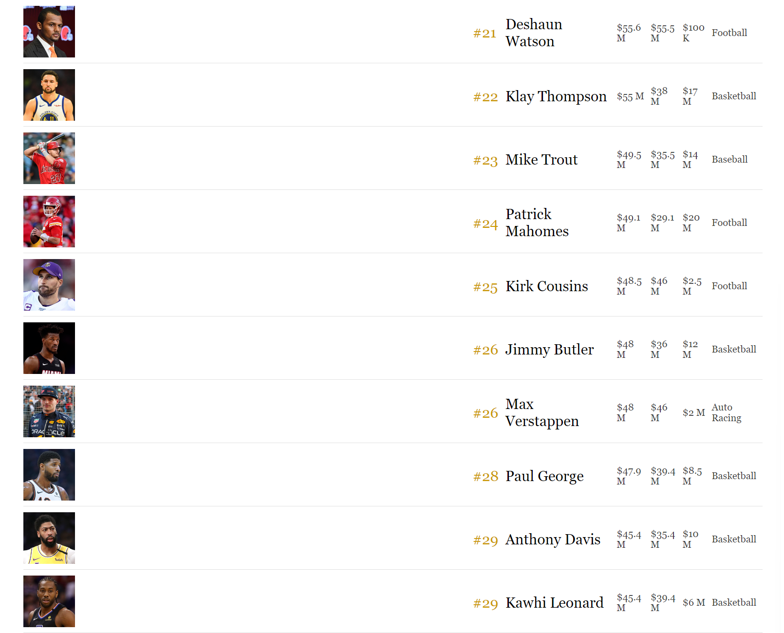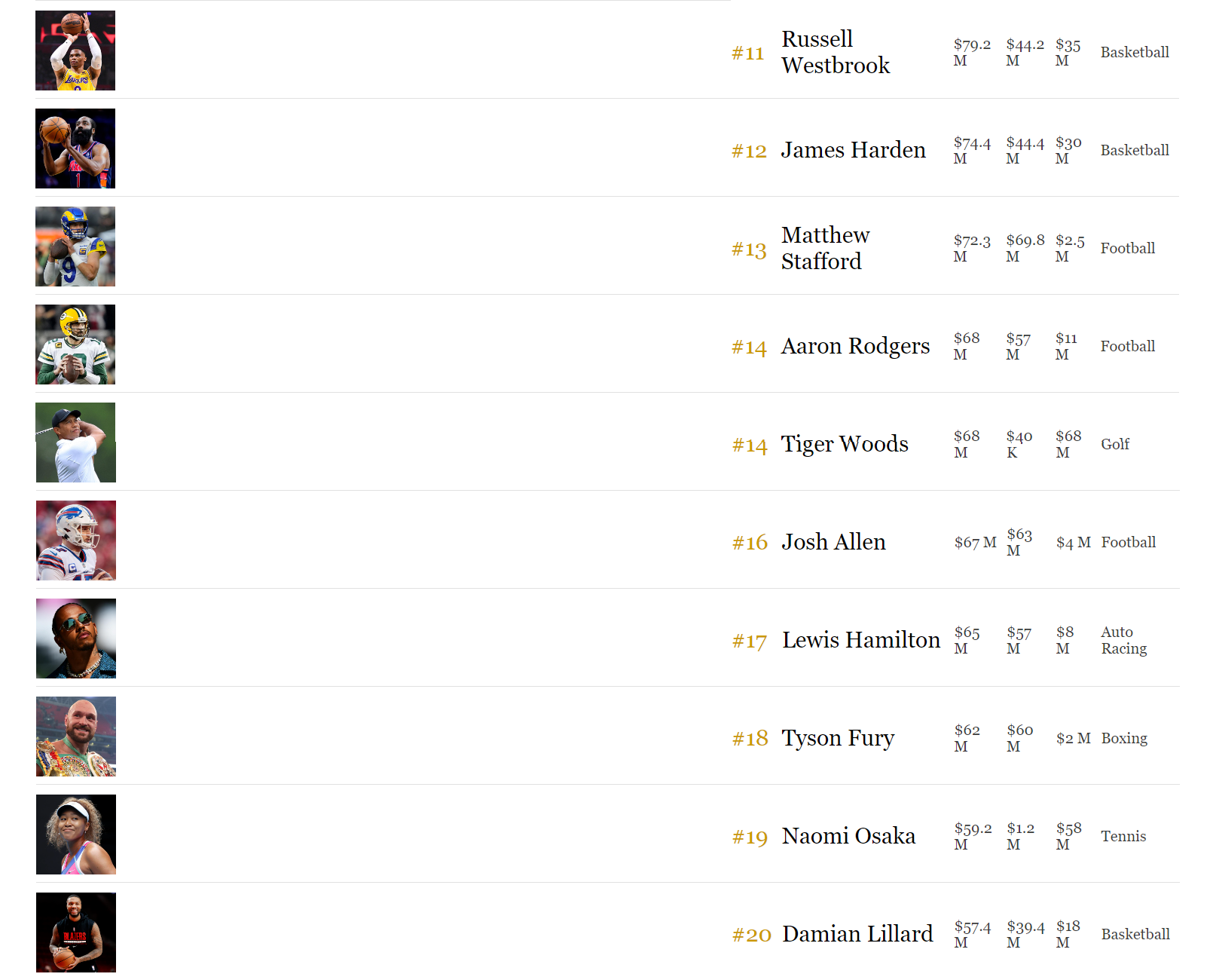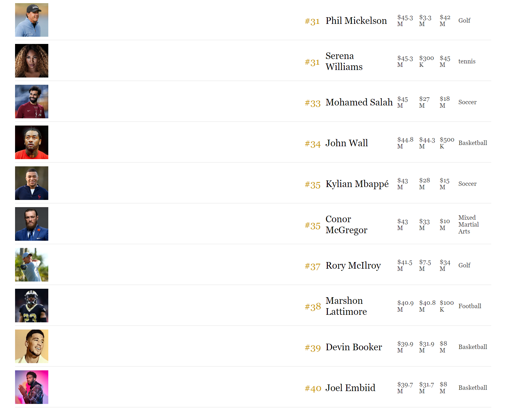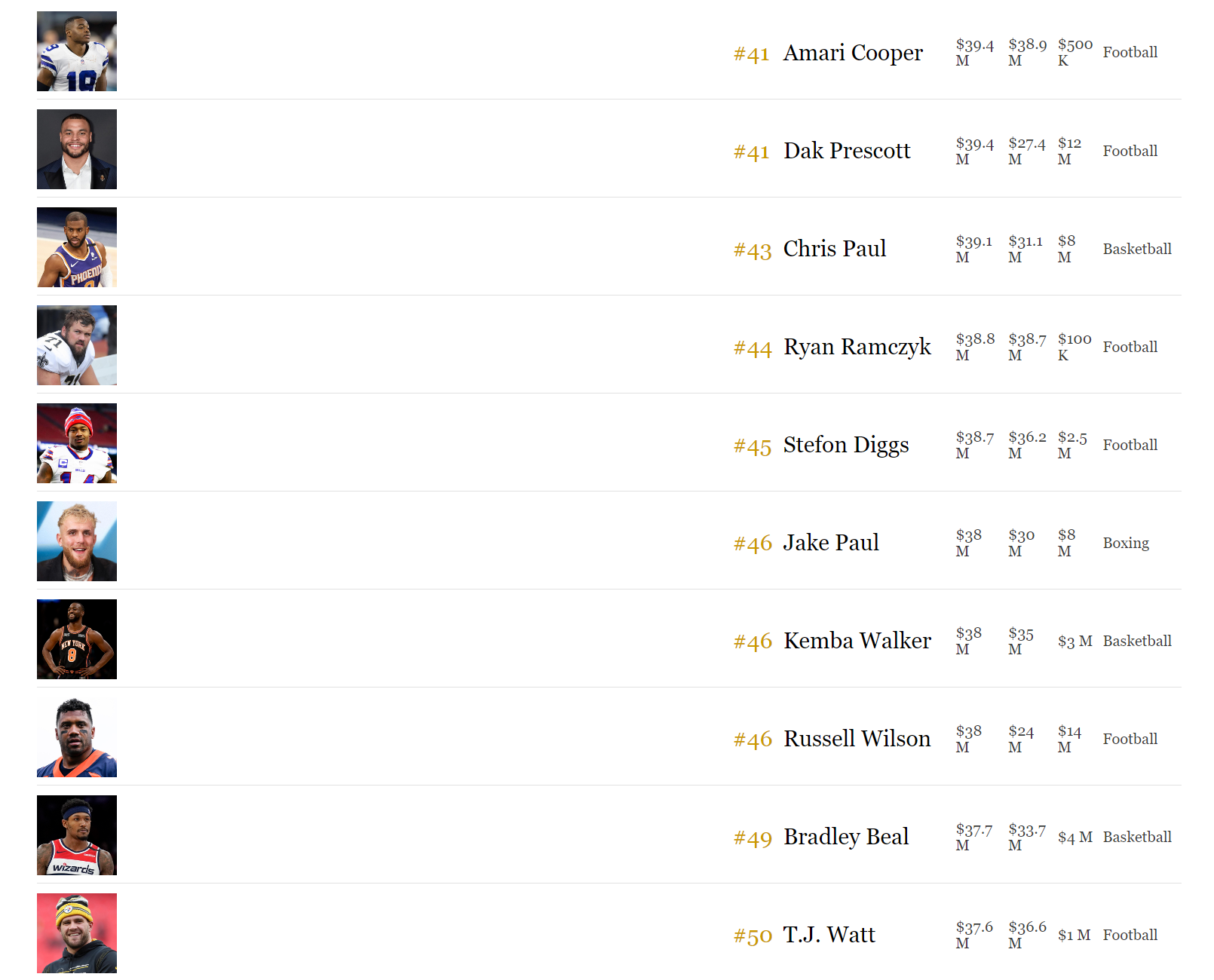 トップ50の内訳は、バスケットボール18名、アメリカンフットボール14名、サッカー5名、テニス3名、ゴルフ3名、ボクシング3名、F1 2名、野球1名、総合格闘技1名。