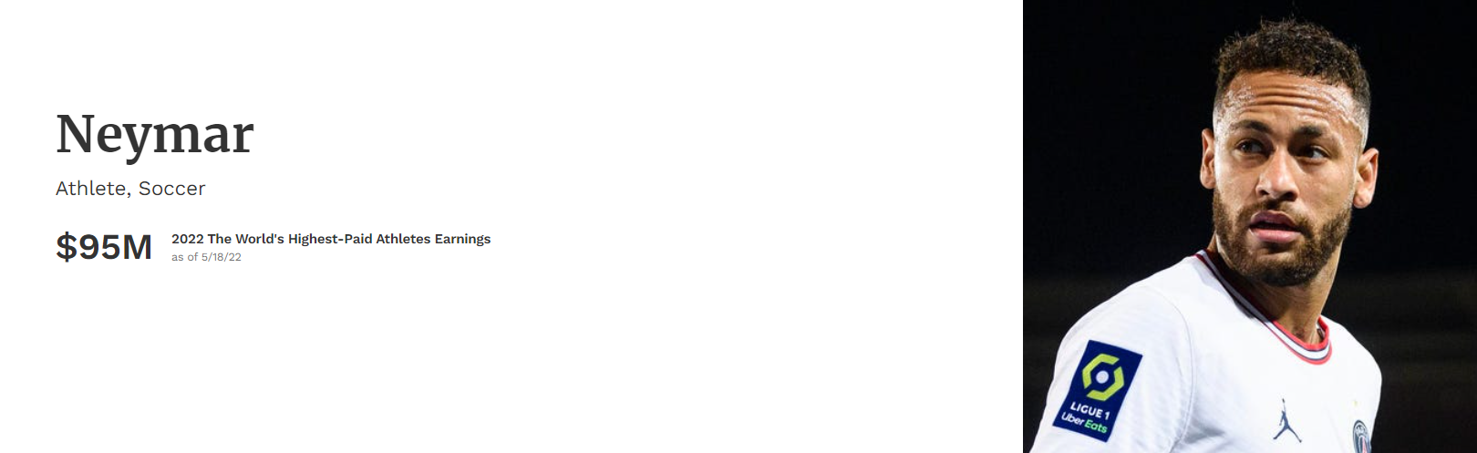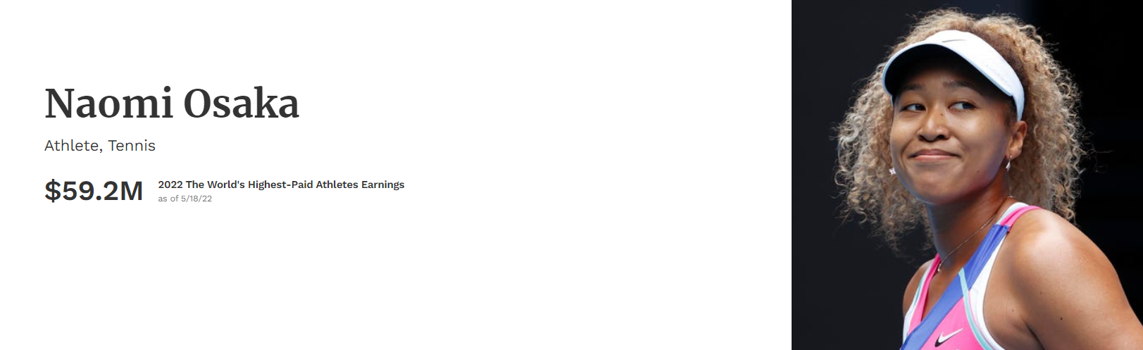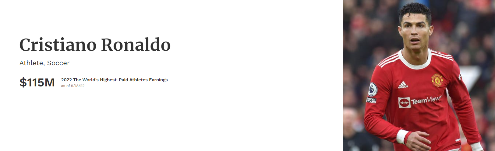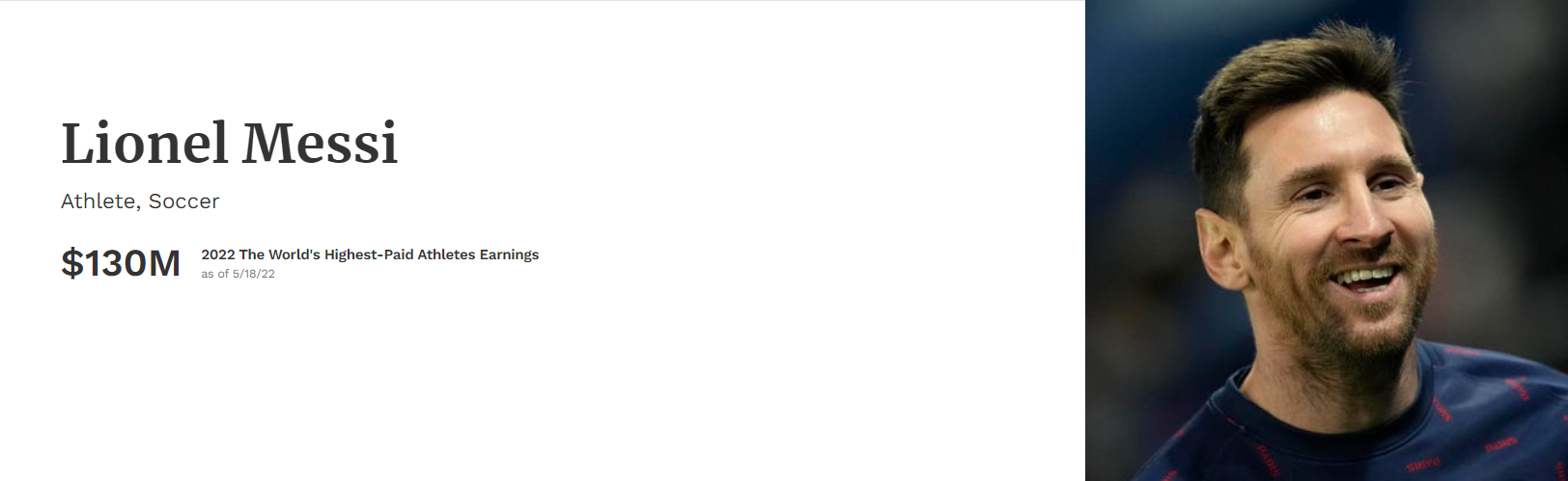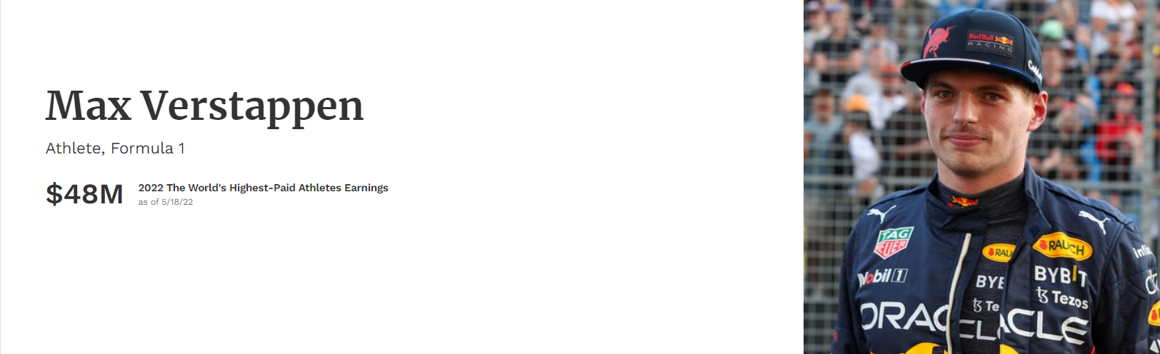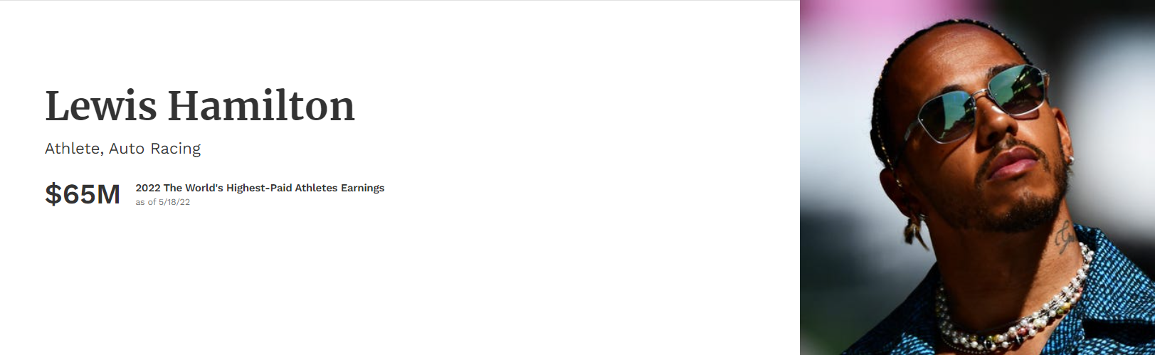 2022年5月18日に発表されたトップ50には、F1ドライバーは2名ランクイン、ルイス・ハミルトン(メルセデス)は、2021年の8位(年収8,200万ドル)から17位(年収6,500万ドル)に、マックス・フェルスタッペン(レッドブル)は26位(年収4,800万ドル)。1位はメッシ、昨年2位(年収1億3,000万ドル)から年収同額でトップに、日本人は大坂なおみが19位(年収5,920万ドル)にランクインしている。過去のランキングは記事下にリンク。