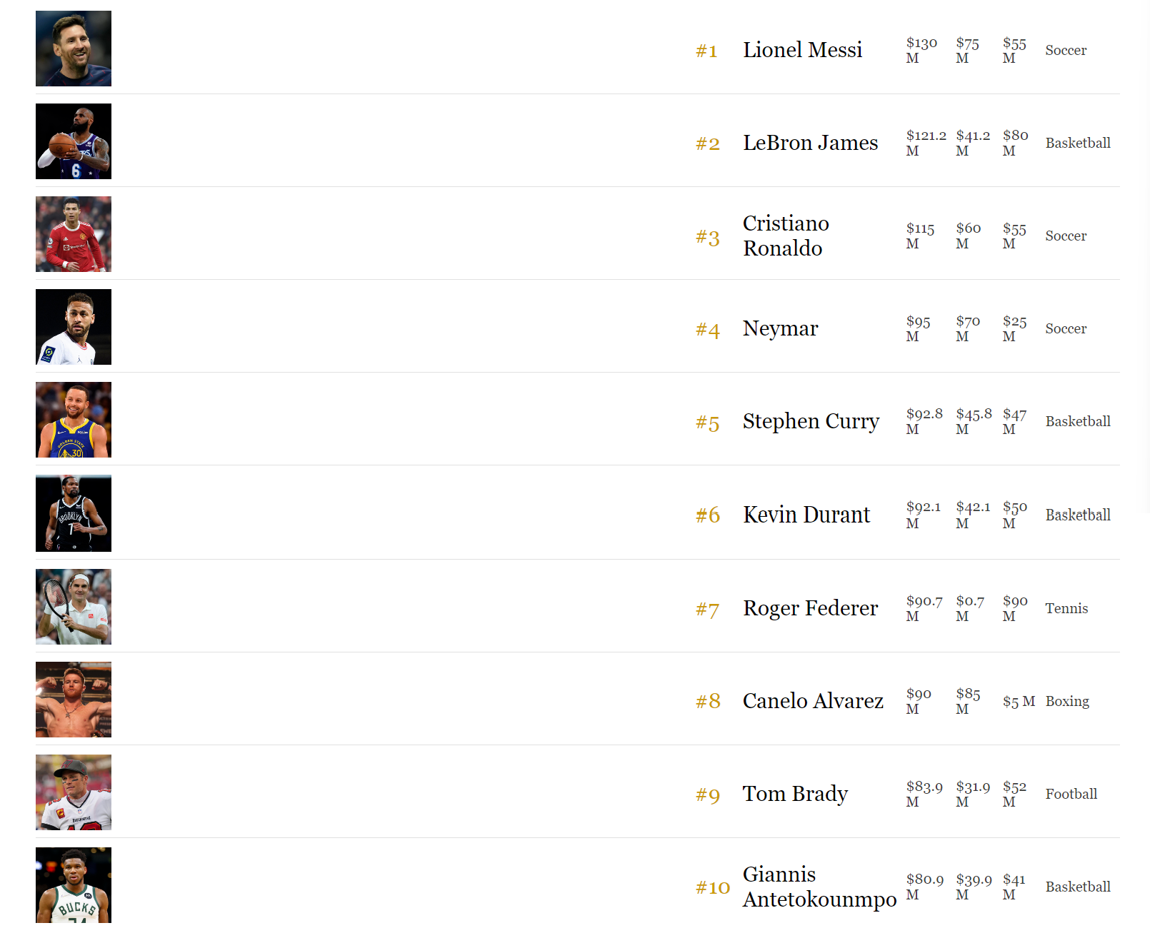 フォーブスが発表した2022年度版世界スポーツ選手長者番付トップ50。