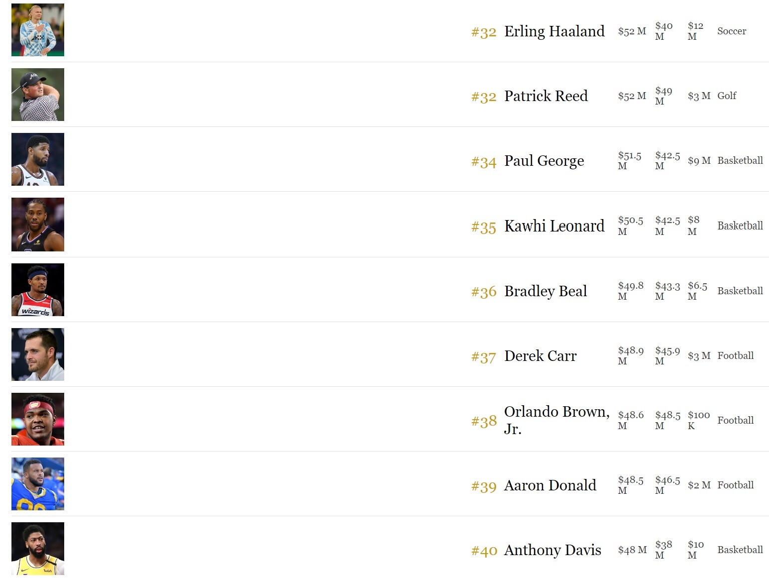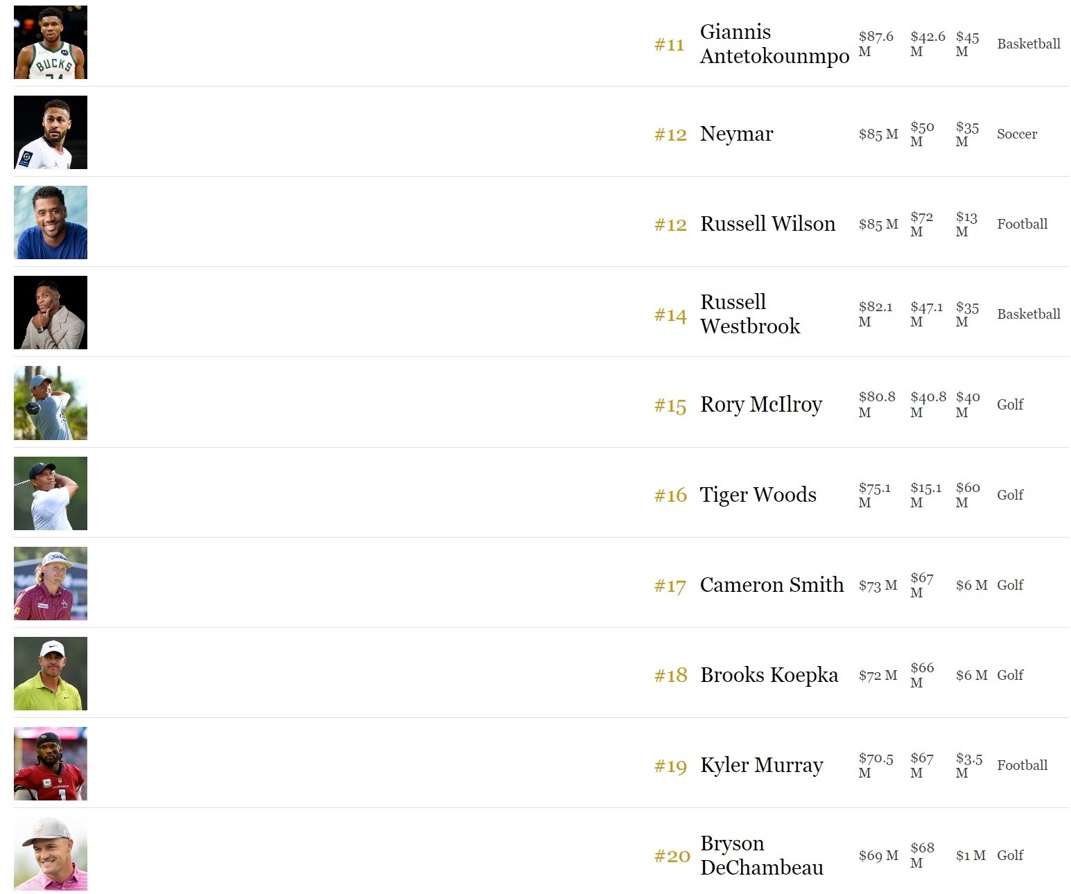 トップ50の内訳は、バスケットボール15名、ゴルフ12名、アメリカンフットボール10名、サッカー6名、テニス2名、ボクシング2名、F1 2名、野球1名。