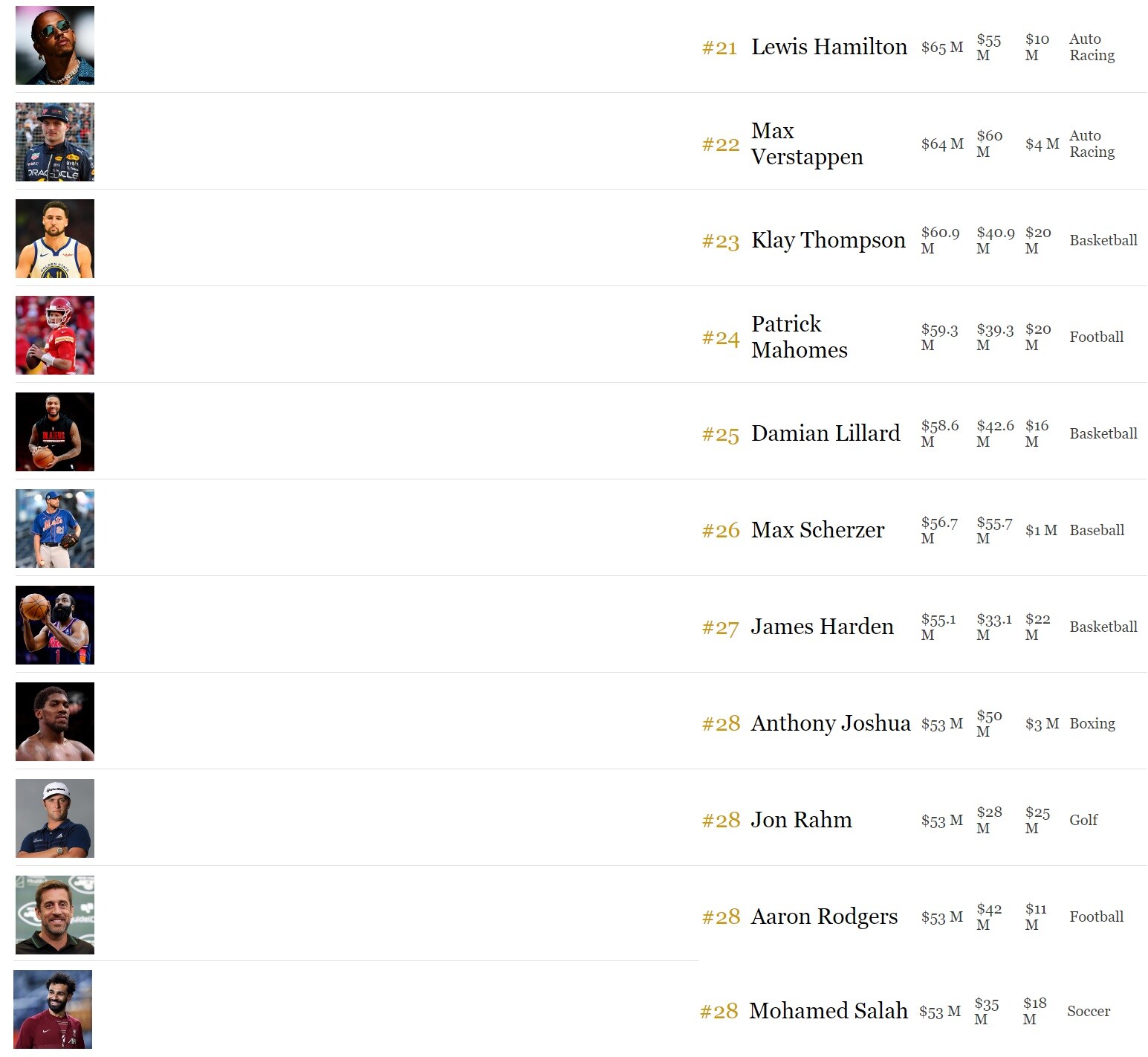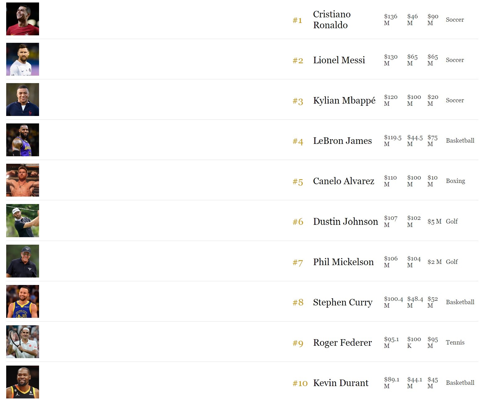 フォーブスが発表した2023年度版世界スポーツ選手長者番付。