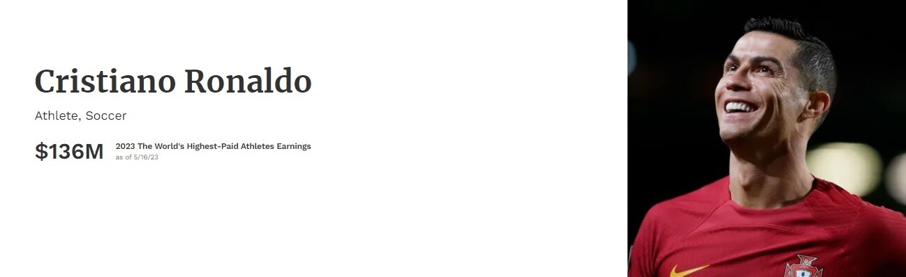 トップはクリスティアーノ・ロナウド、イングランドのプレミアリーグからサウジアラビアのアル・ナスルに移籍し、昨年の3位(推定1億1,500万ドル)から、この1年間で推定1億3,600万ドルを稼いだ。