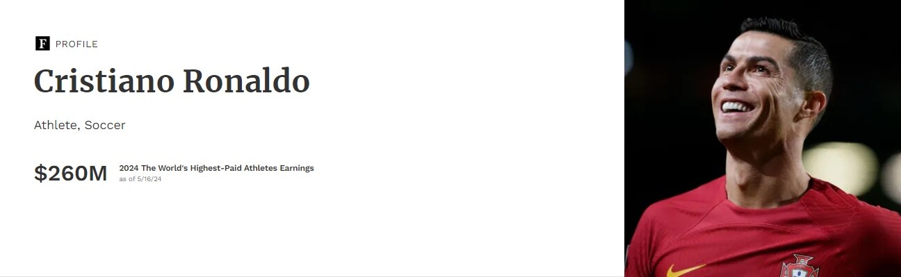 トップは2年連続クリスティアーノ・ロナウド、サウジマネーによって年収は倍近くになり、昨年の推定1億3,600万ドルから、1億2,400万ドル多い、推定2億6,000万ドル(403億円*)を過去12カ月間で稼ぎ、彼のキャリアで4回目の世界最高年収のスポーツ選手になった。