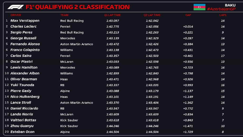 F1アゼルバイジャンGP予選Q2順位