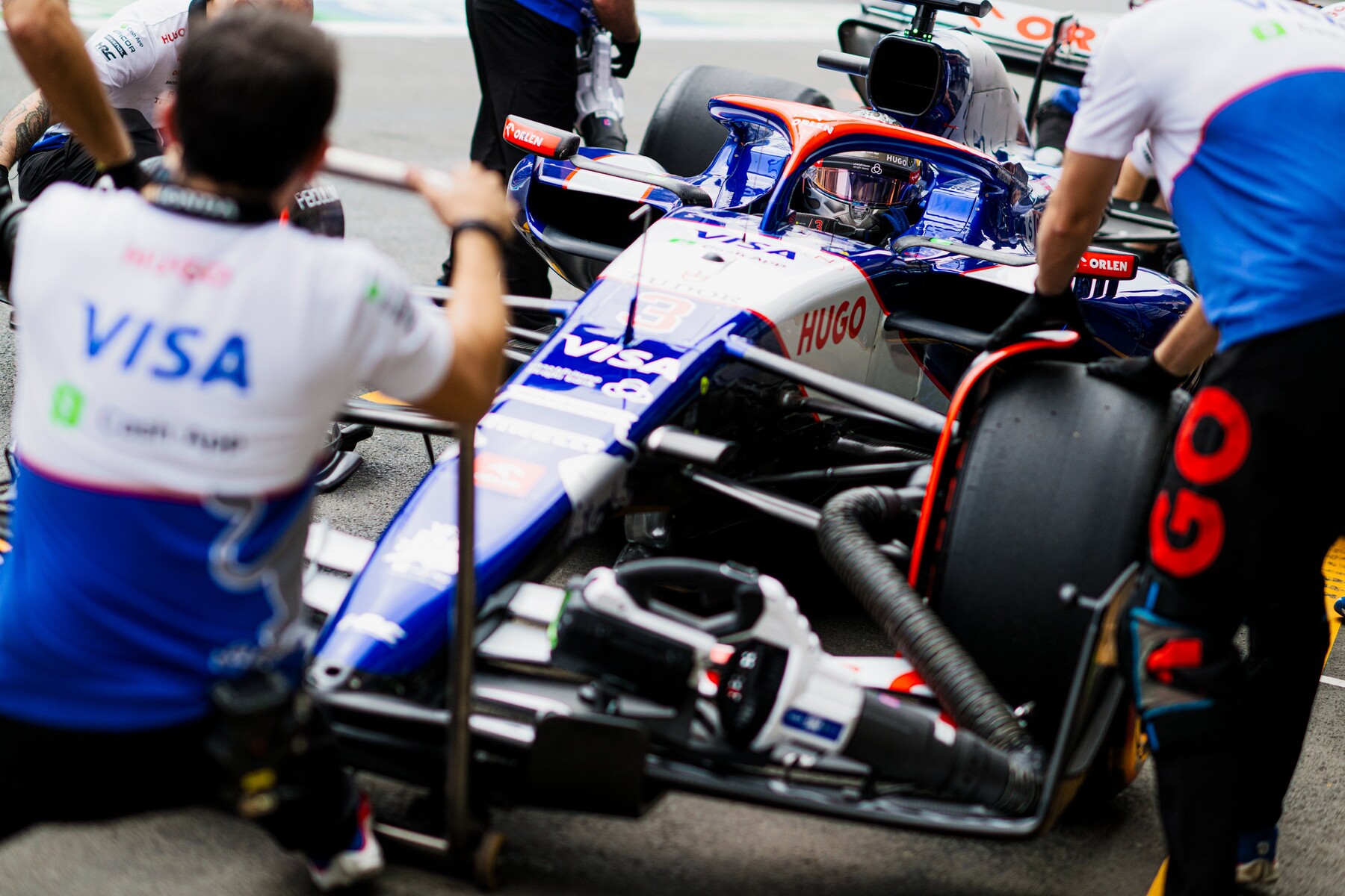 アルボン、ピットレーンの出口で止まっている:エアボックスの中にファンが入ったまま出たらしい。