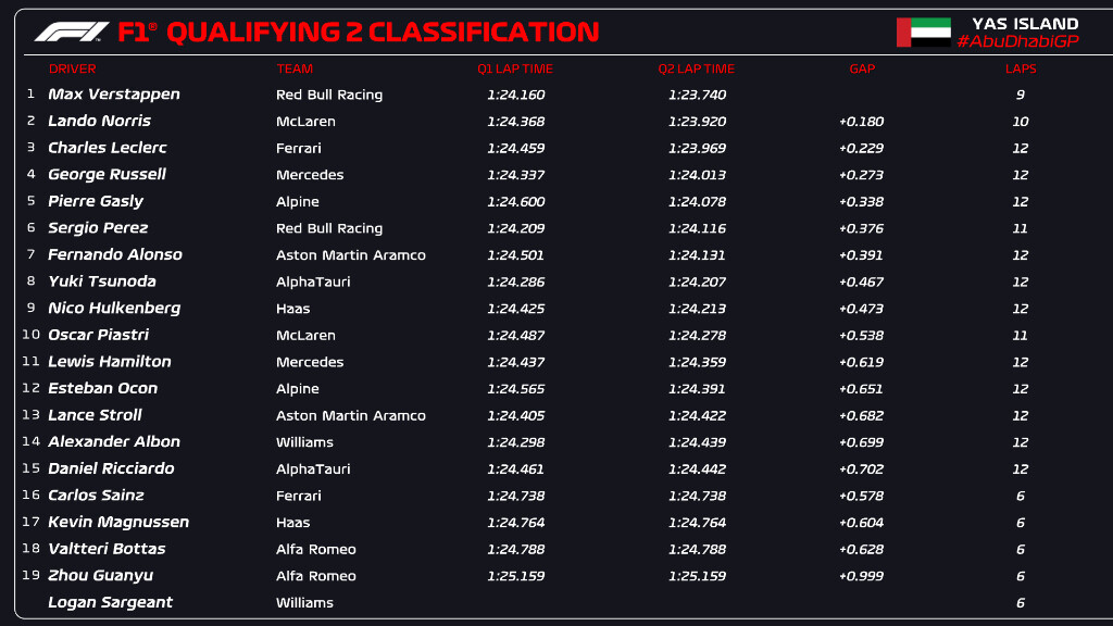 F1アブダビGP予選Q2順位