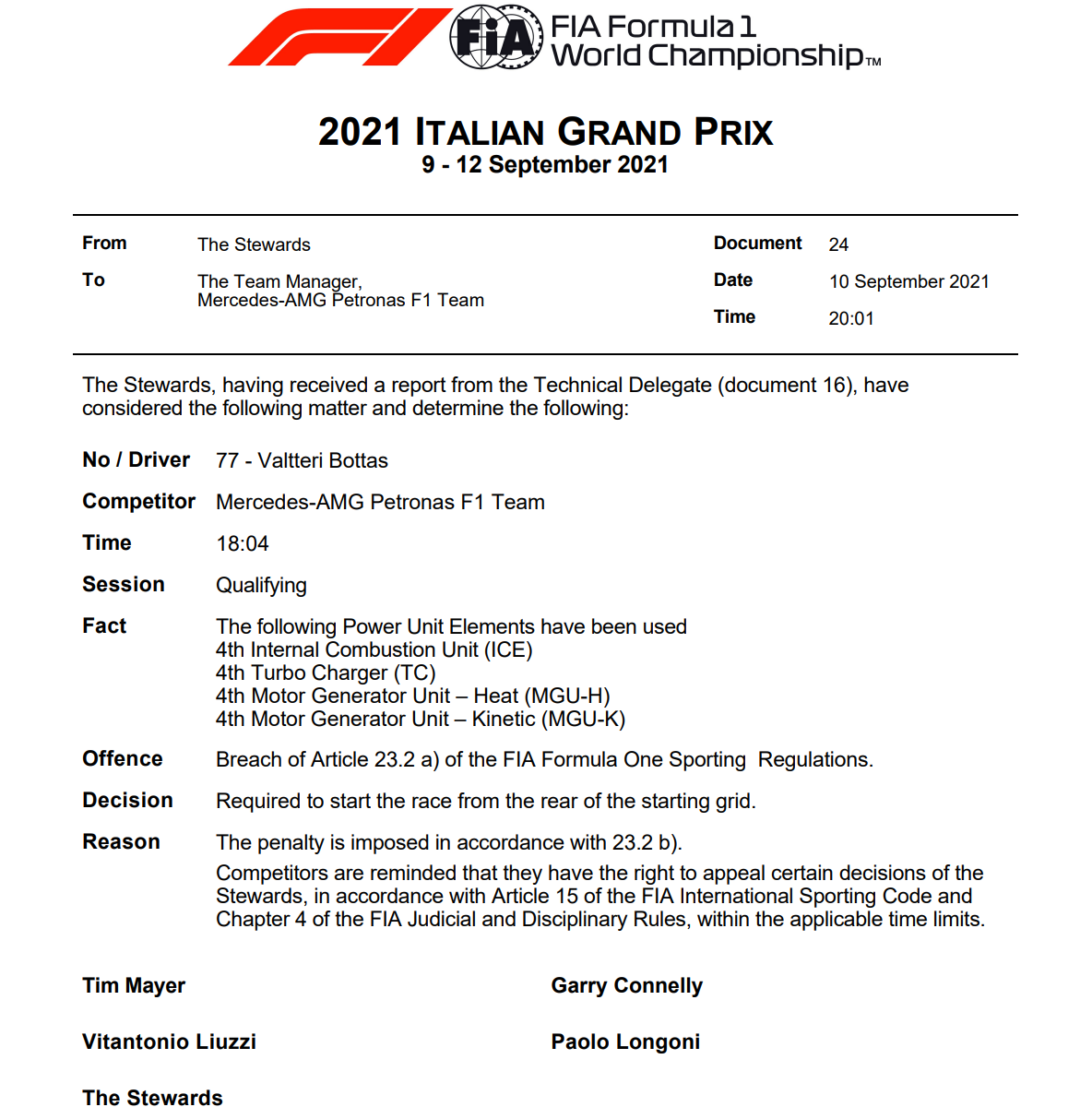 4基目のICE(エンジン)、4基目のTC(ターボチャージャー)、4基目のMGU-H(モータージェネレーター熱ユニット)、4基目のMGU-K(モータージェネレーター運動ユニット)を使用のためペナルティを受ける。