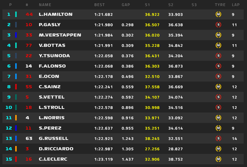 1番ハミルトン、2番ガスリー、3番フェルスタッペン、4番ボタス、5番角田裕毅