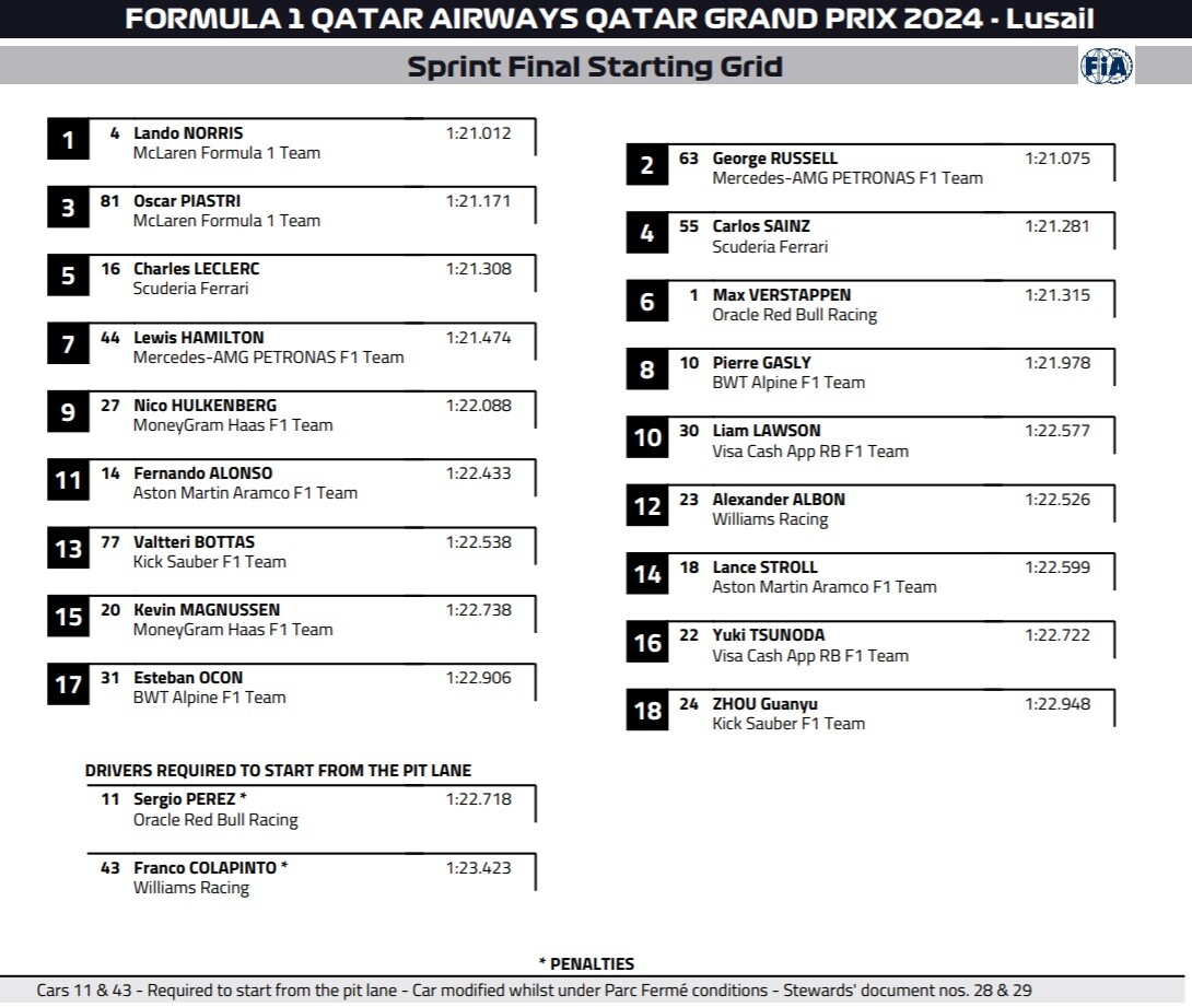 2024年F1カタールGP スプリント・スターティンググリッド