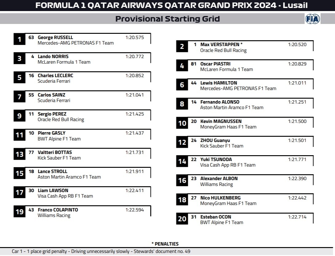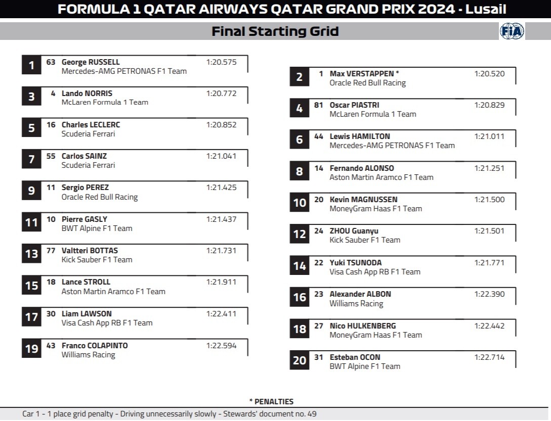 2024年F1カタールGP スターティンググリッド