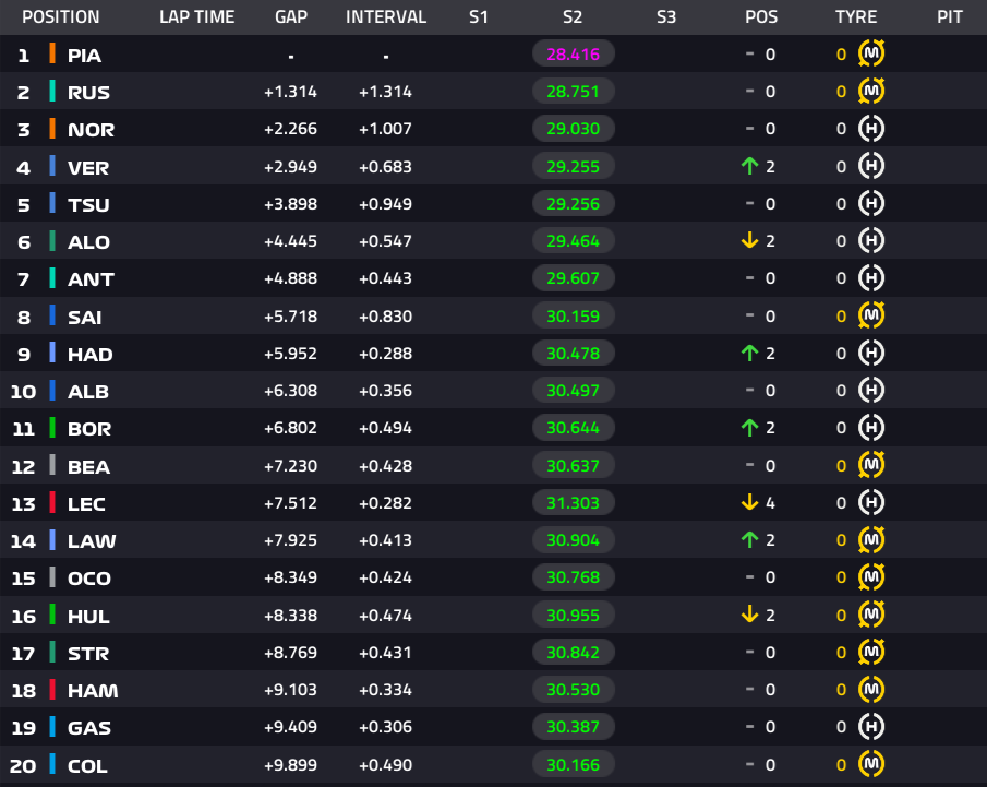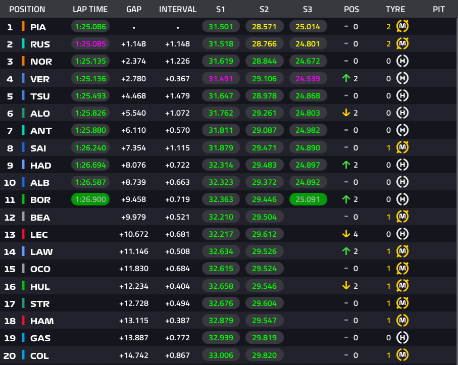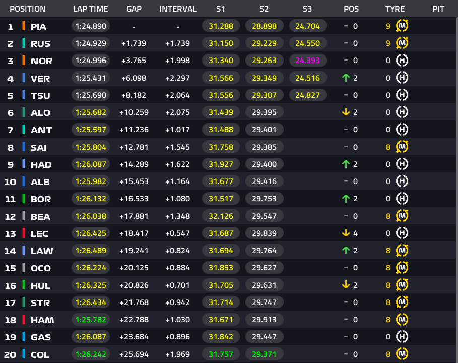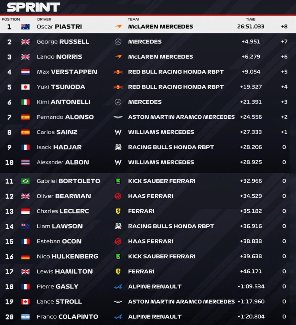 2位ラッセル、3位ノリス、4位フェルスタッペン、5位角田裕毅、6位アントネッリ、7位アロンソ、8位サインツ。