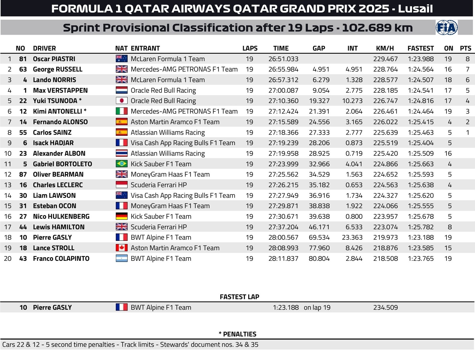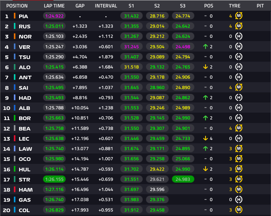 1位ピアストリ、2位ラッセル、3位ノリス、4位フェルスタッペン、5位角田裕毅、6位アロンソ