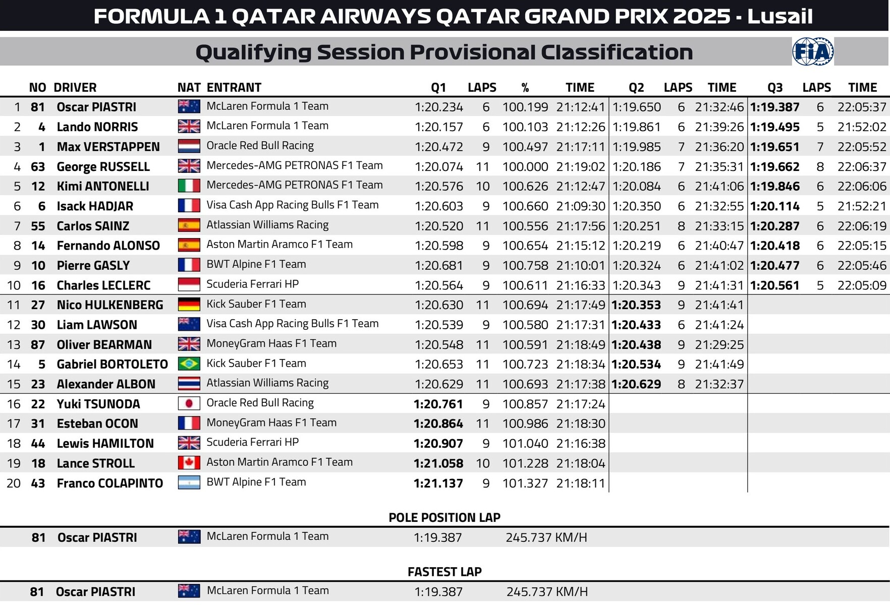 F1カタールGP予選Q3順位