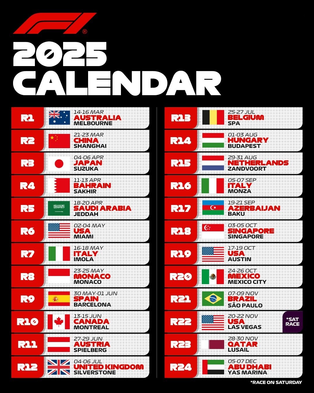FIA(国際自動車連盟)とフォーミュラ1は、2025年のFIAフォーミュラワン・ワールドチャンピオンシップのカレンダーを発表し、チャンピオンシップが75周年を迎えるにあたり、ファン、ドライバー、チームのために24戦のシーズンが予定されている。