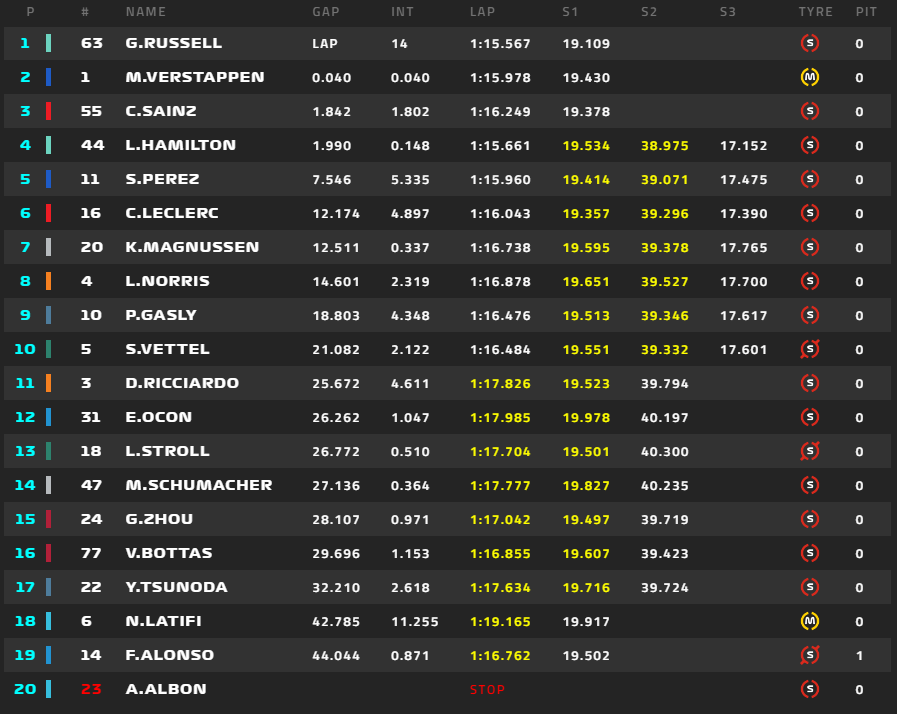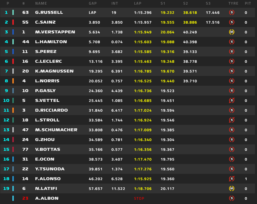 ラッセル、トップを走行、2位サインツに4秒差。