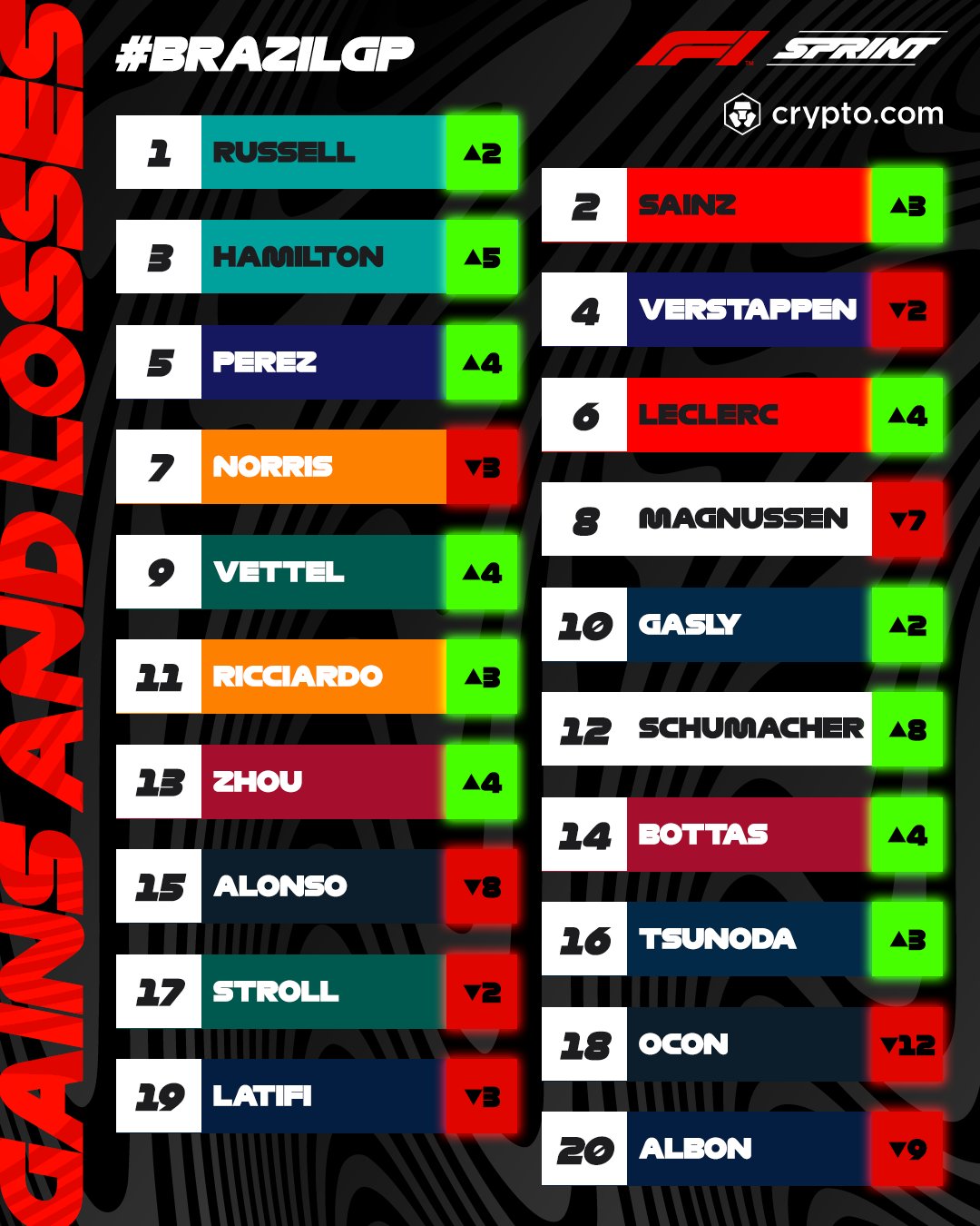 順位移動数:シューマッハが20位から12位に上がっている。