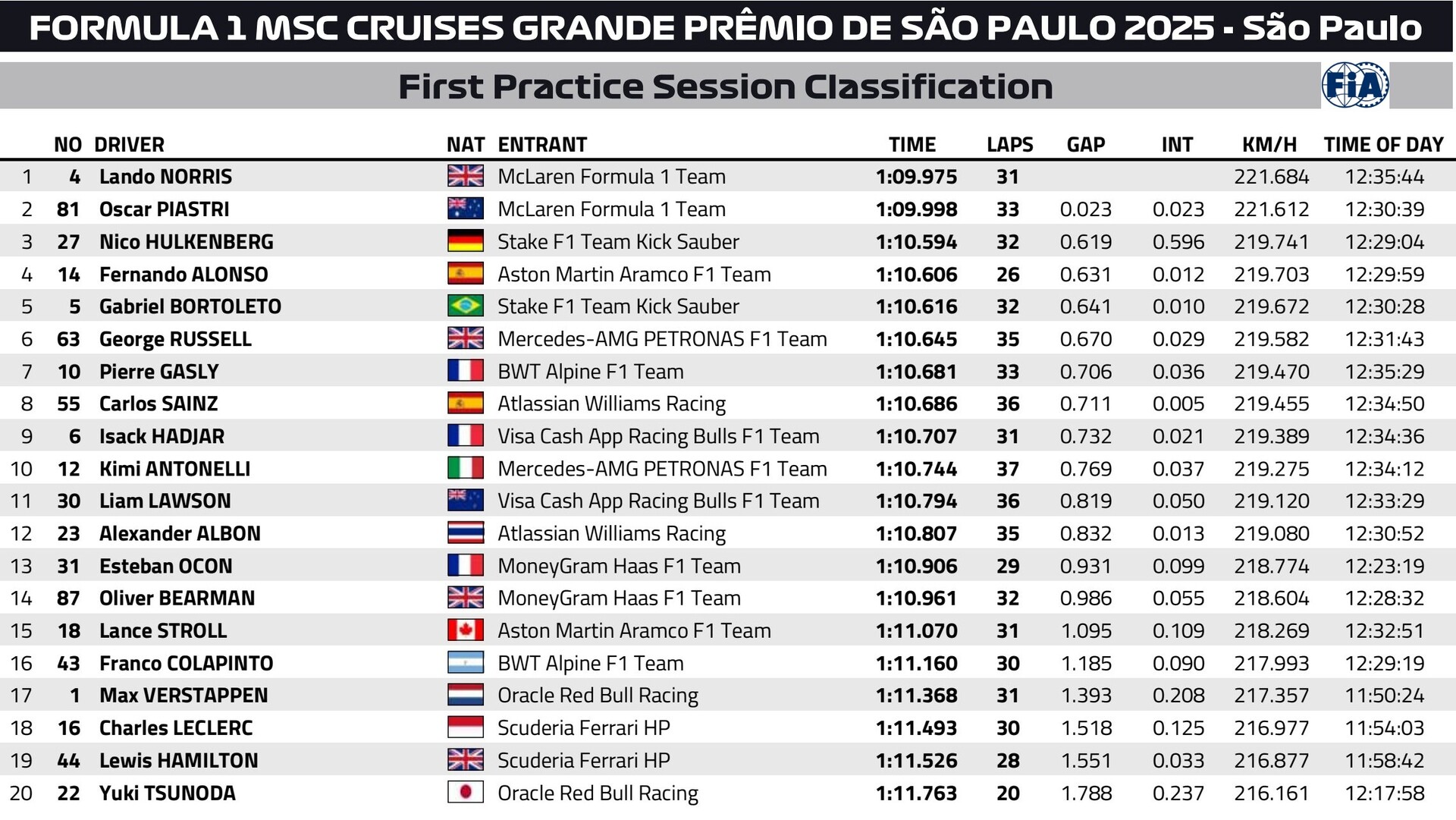 2025年F1サンパウロGPフリー走行1回目