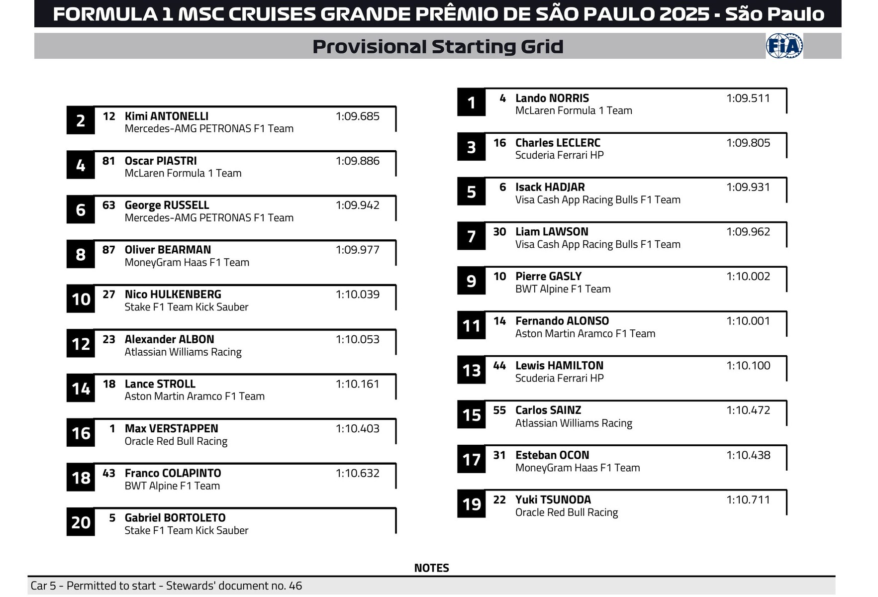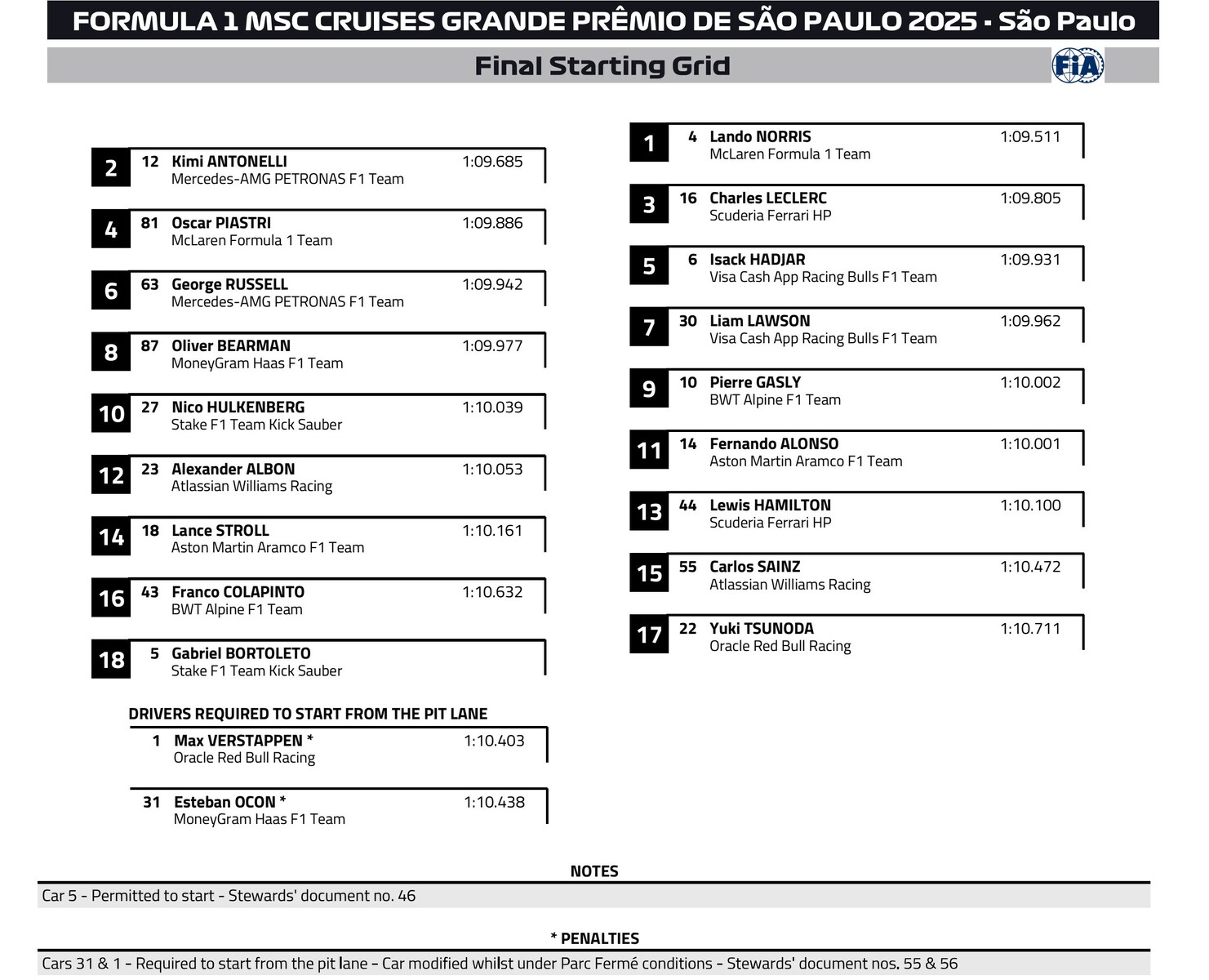 2025年F1サンパウロGP スターティンググリッド