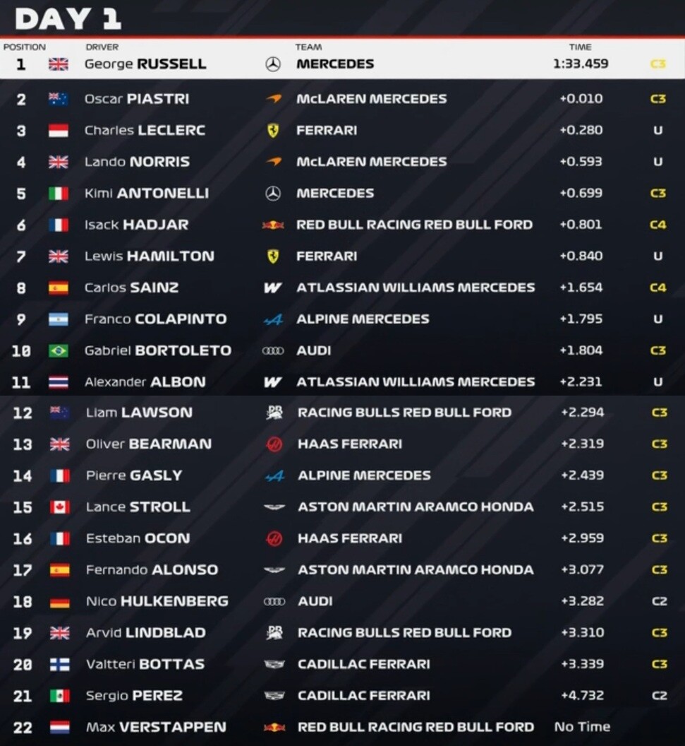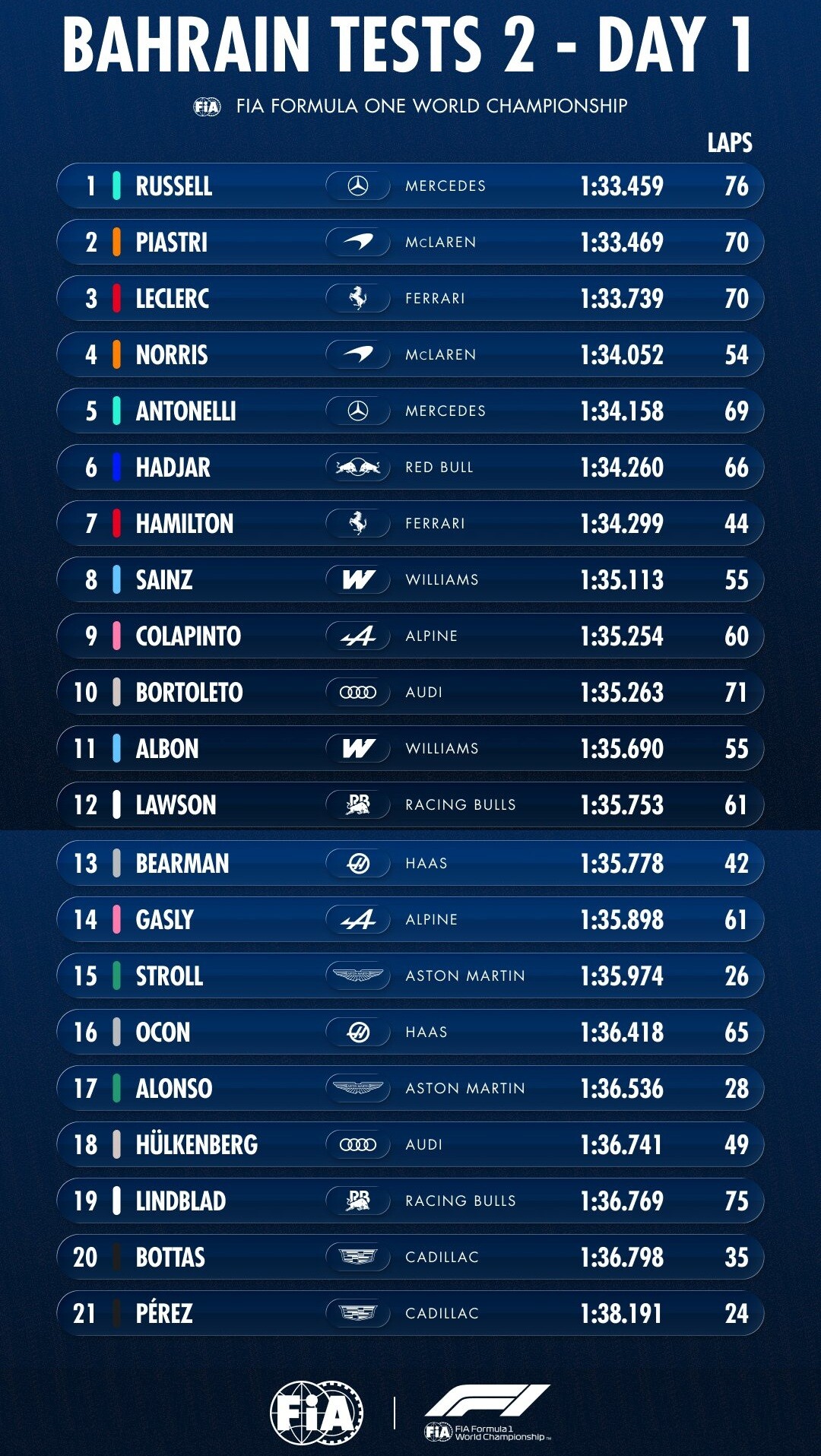 2026年F1プレシーズンテスト2 - 2月18日タイムシート
