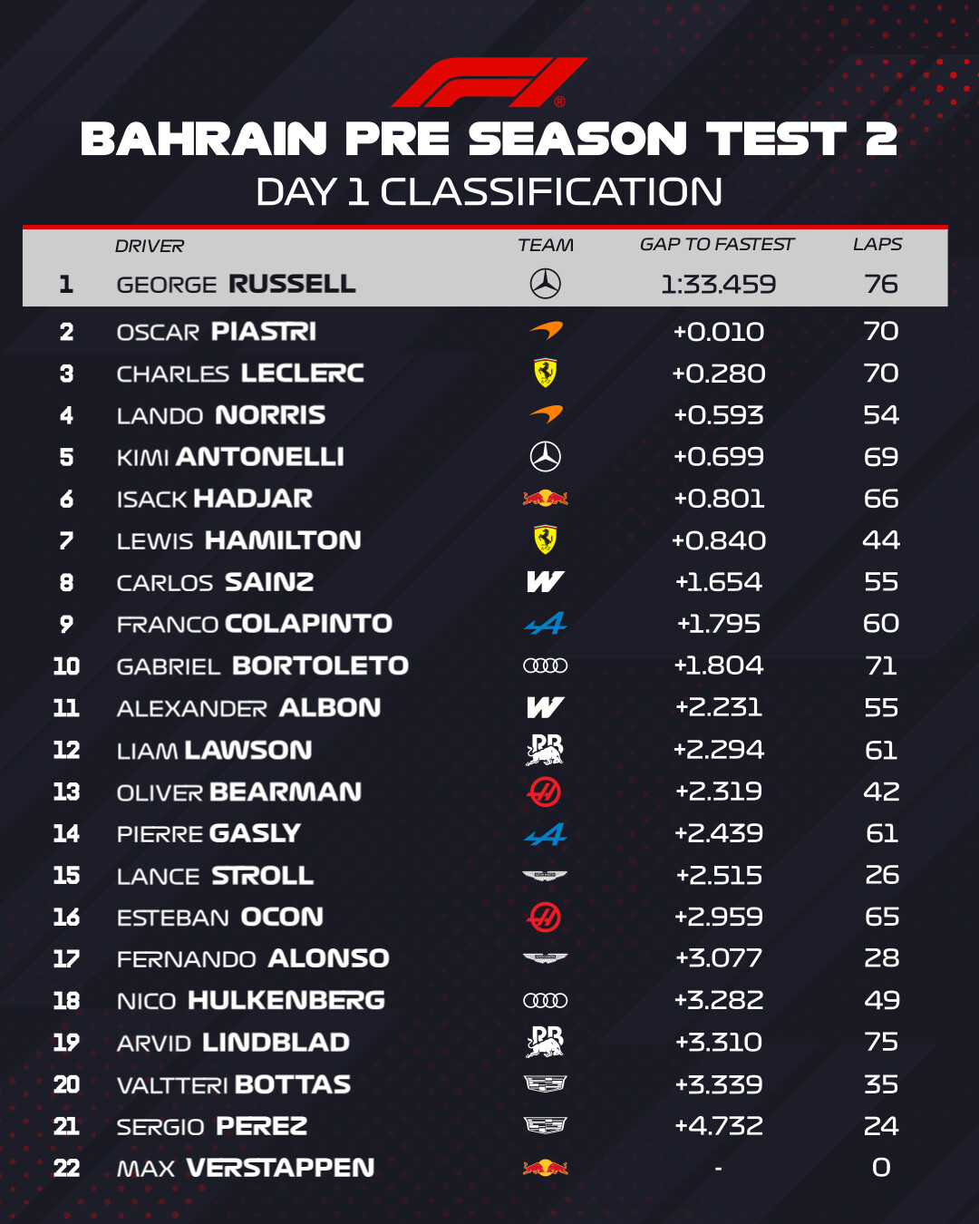 バーレーンで開催の2回目のプレシーズンテスト初日が終了、メルセデスのジョージ・ラッセルが最速ラップタイム。マックス・フェルスタッペン以外21名のドライバーが走行した。