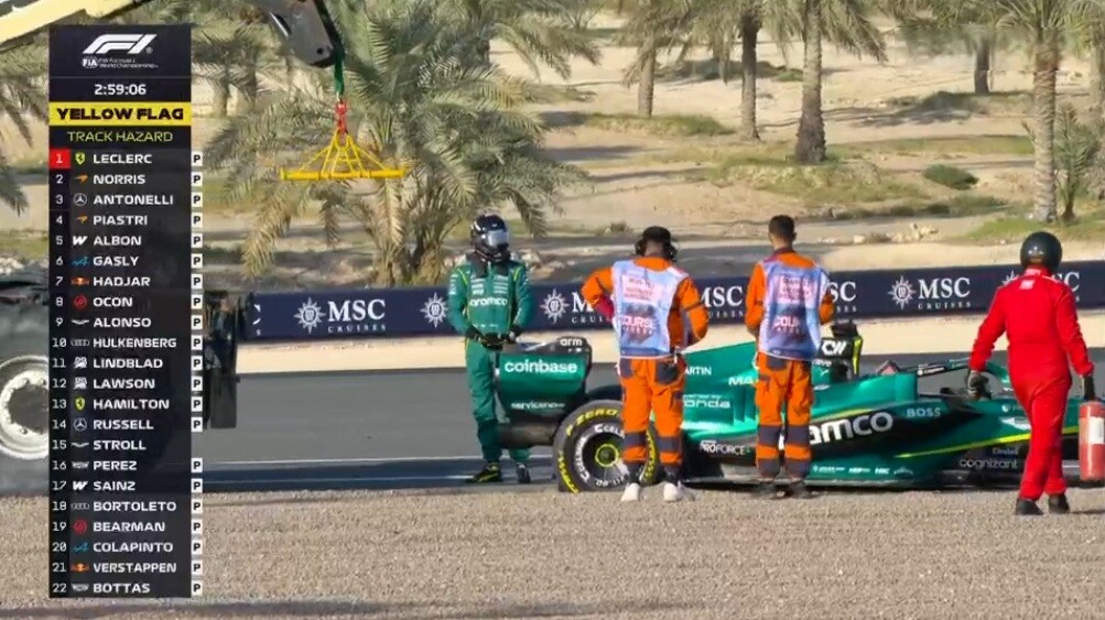 ストロール、ターン11でスピンしてグラベルでストップ、赤旗が出る。