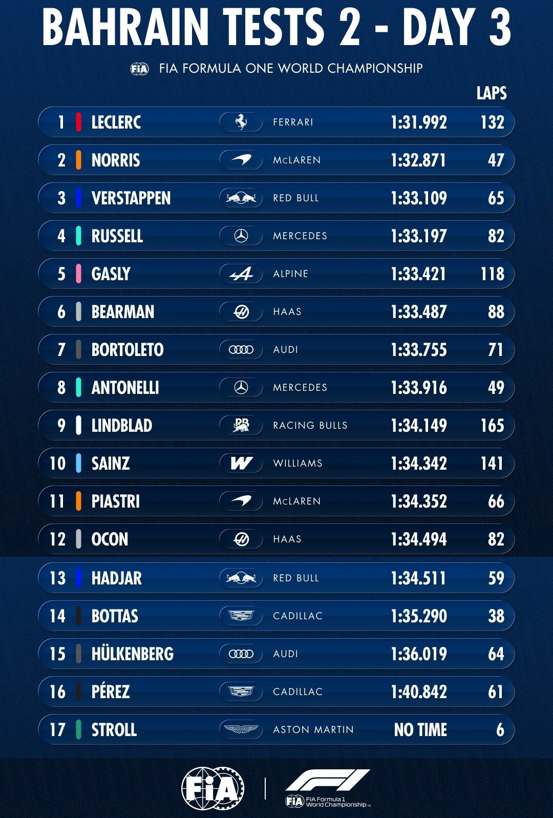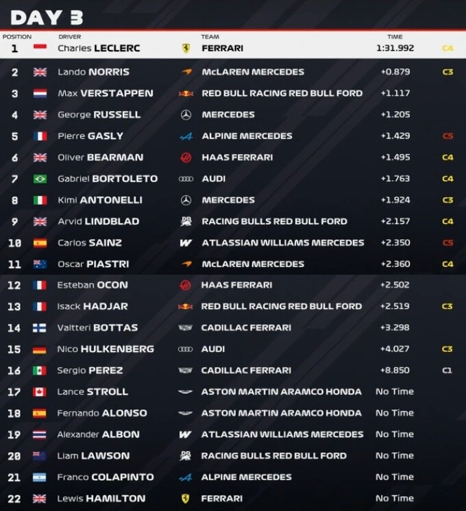 2026年F1プレシーズンテスト2 - 2月20日タイムシート