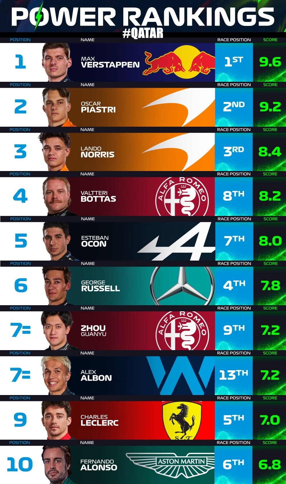 土曜日のスプリントでワールドチャンピオンに輝いたマックス・フェルスタッペンが、日曜日に今季14勝目を挙げた。このオランダ人ドライバーとスプリント優勝者のオスカー・ピアストリは審査員に感銘を与えた。さて、今週のトップ10にはこの2人の他に誰が入るだろうか?