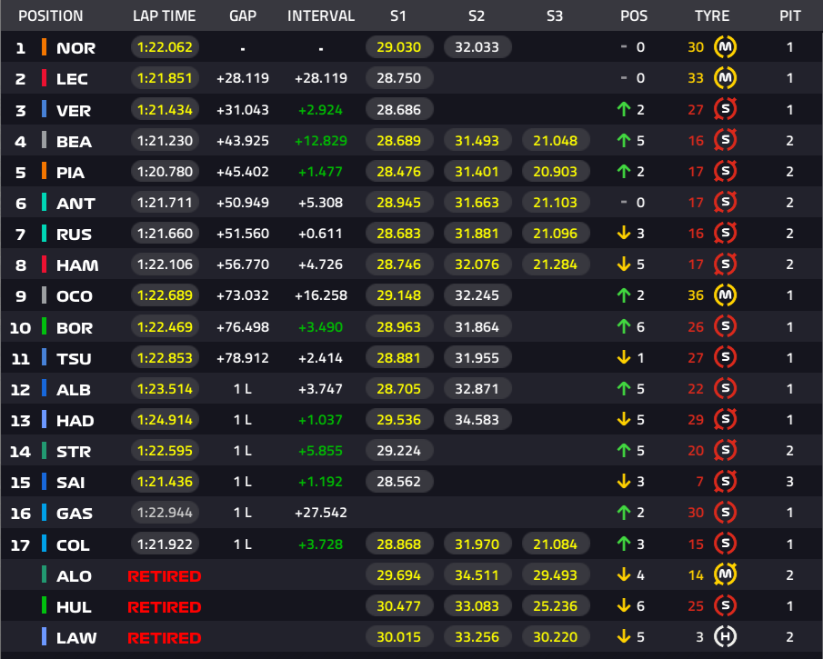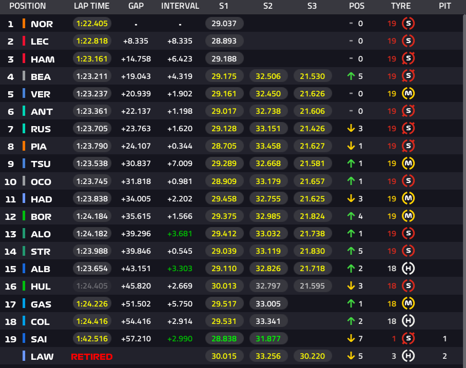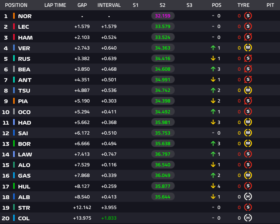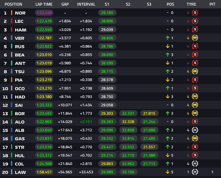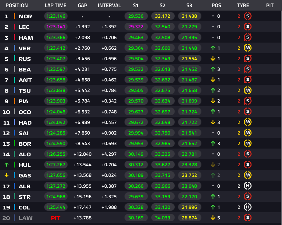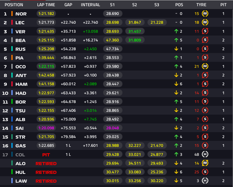 ノリス、トップ独走:2位ルクレールとは20秒差!