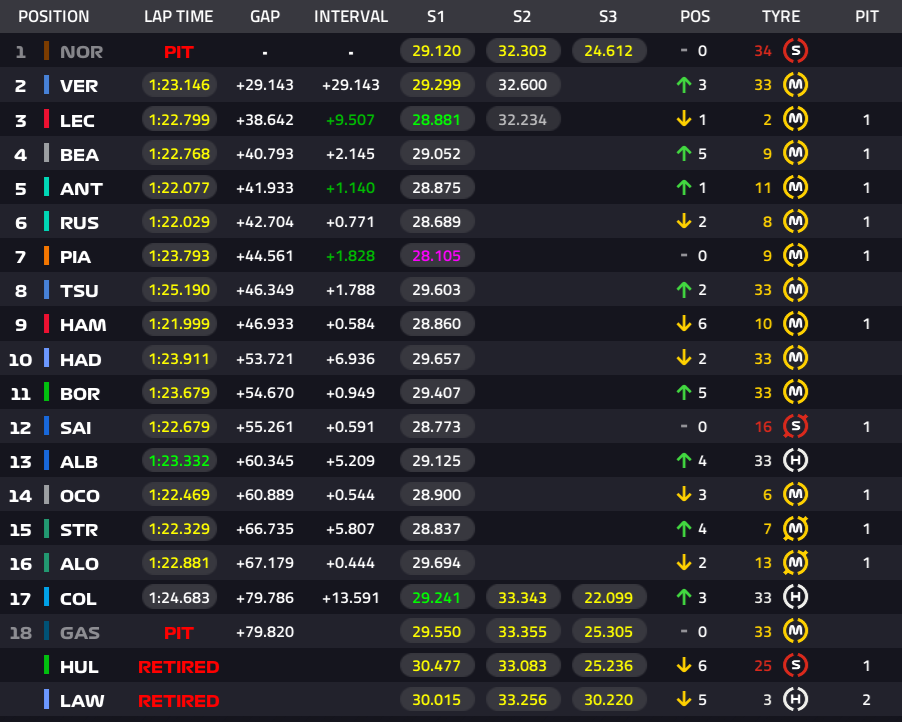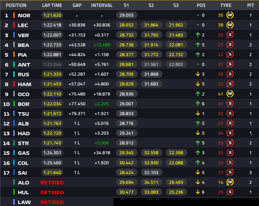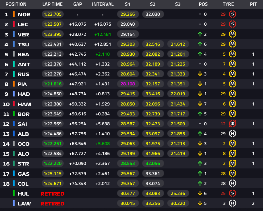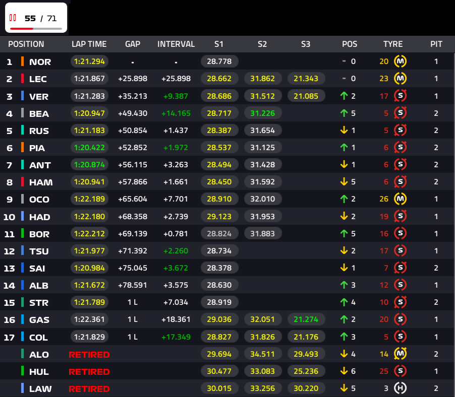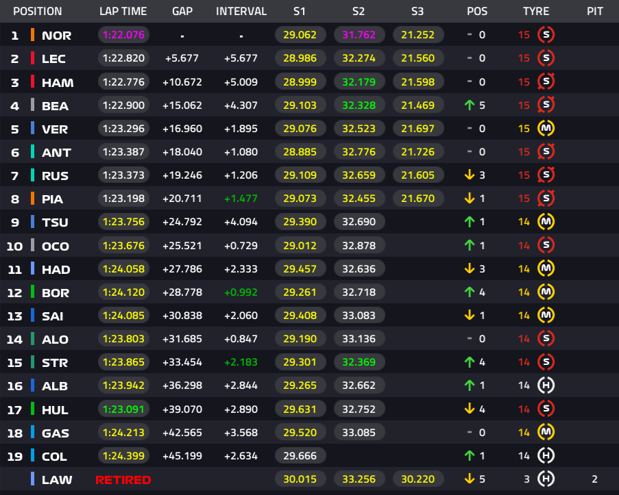 ノリス、トップ独走:2位ルクレールとは20秒差!