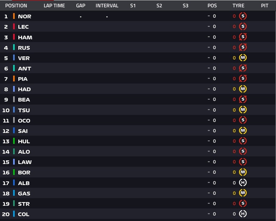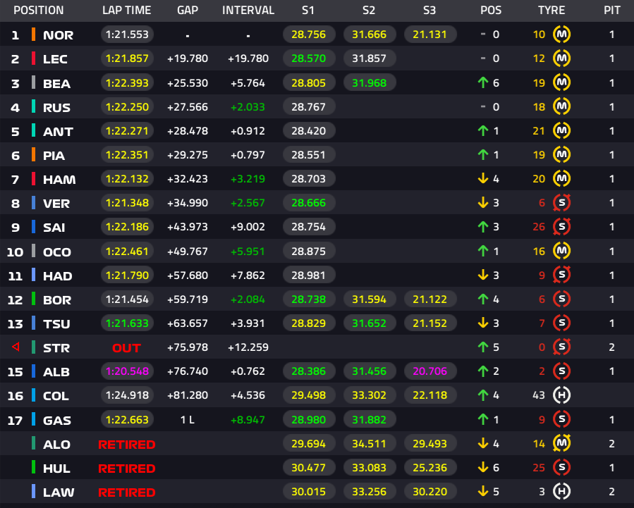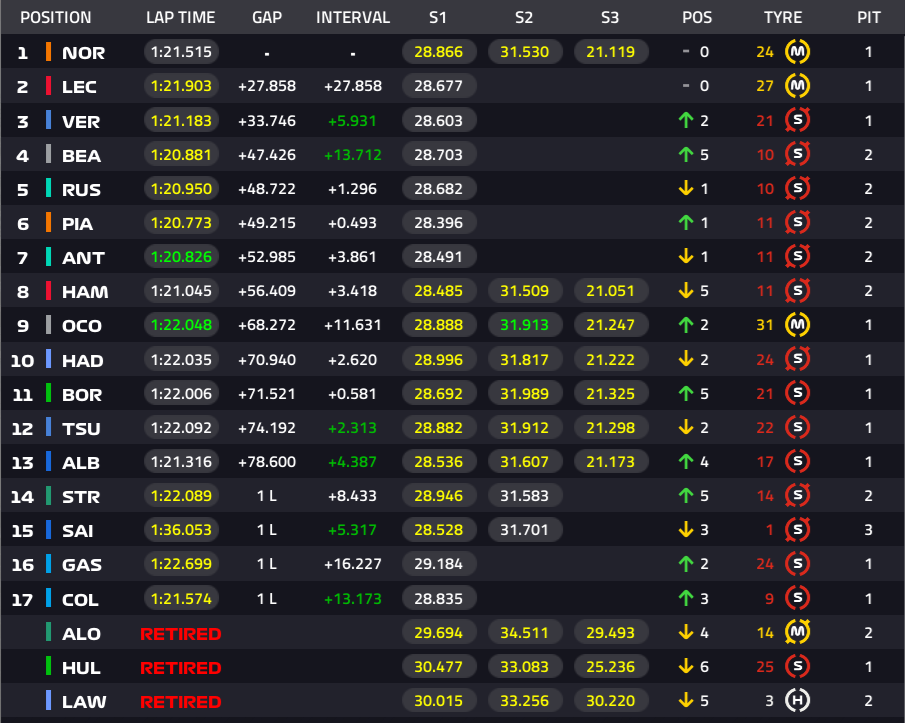 2位ルクレール、3位フェルスタッペン、4位ベアマン、5位ピアストリ、6位アントネッリ、角田は11位。