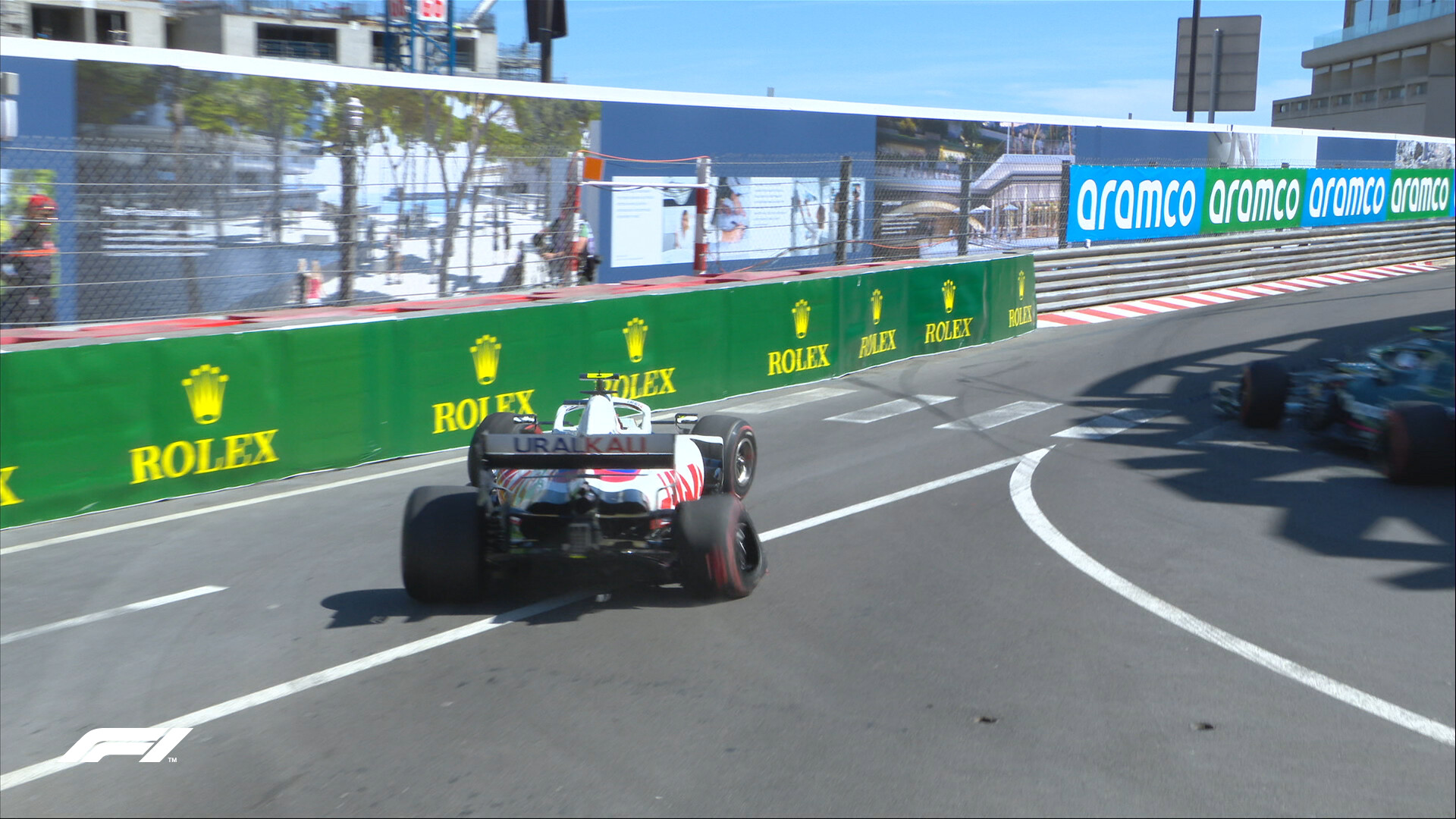 ミック・シューマッハ、右リア・タイヤが破損、本人は「パンク」でスロー走行