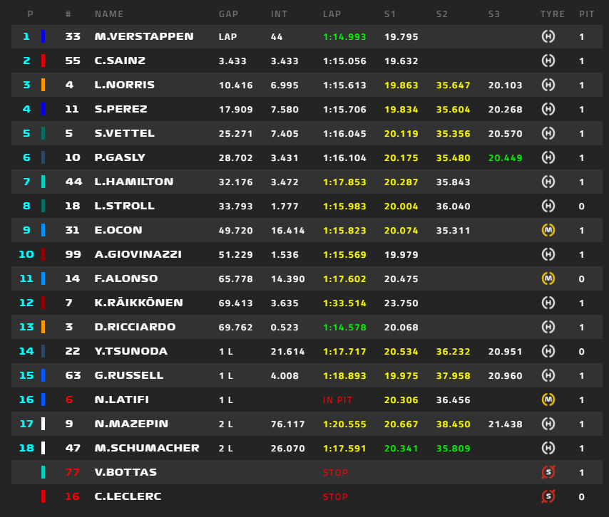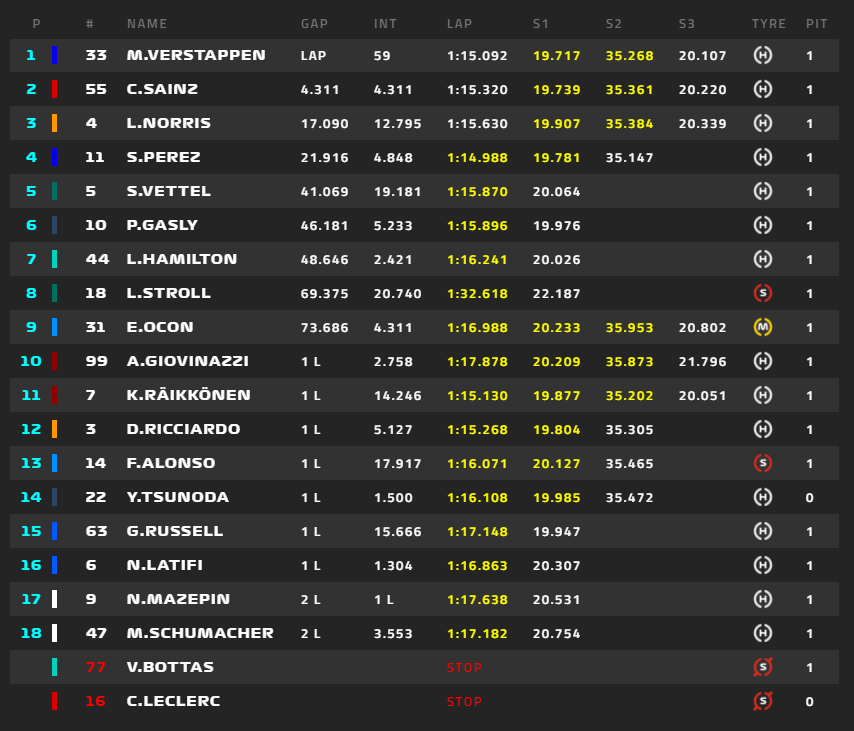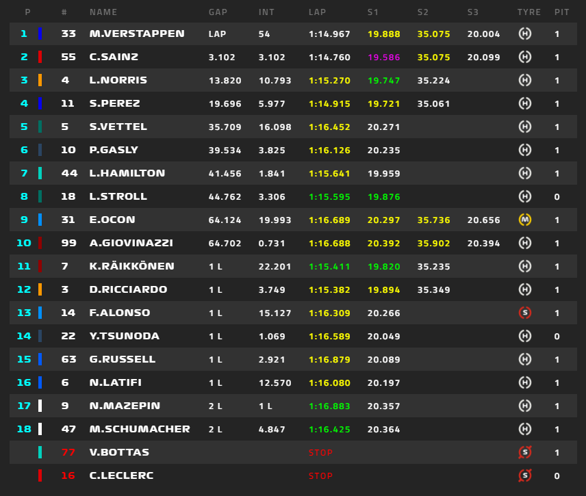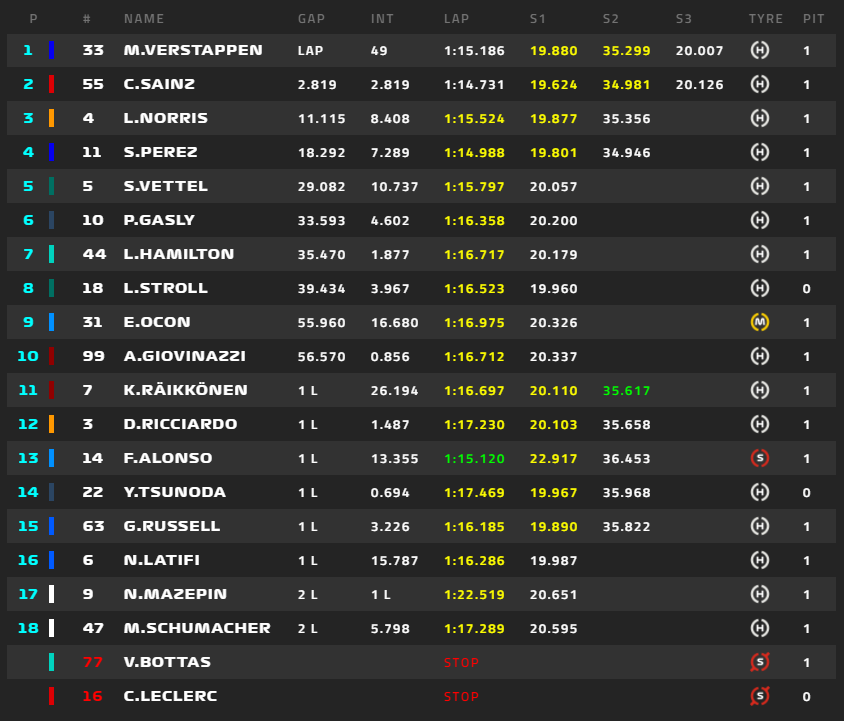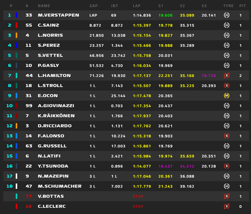 1位フェルスタッペン、2位ボタス、3位サインツ、4位ノリス、5位ガスリー、6位ハミルトン、角田裕毅は16位。