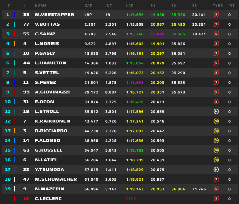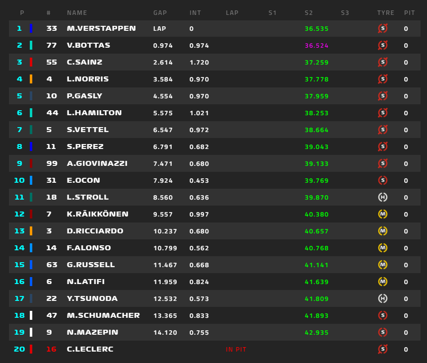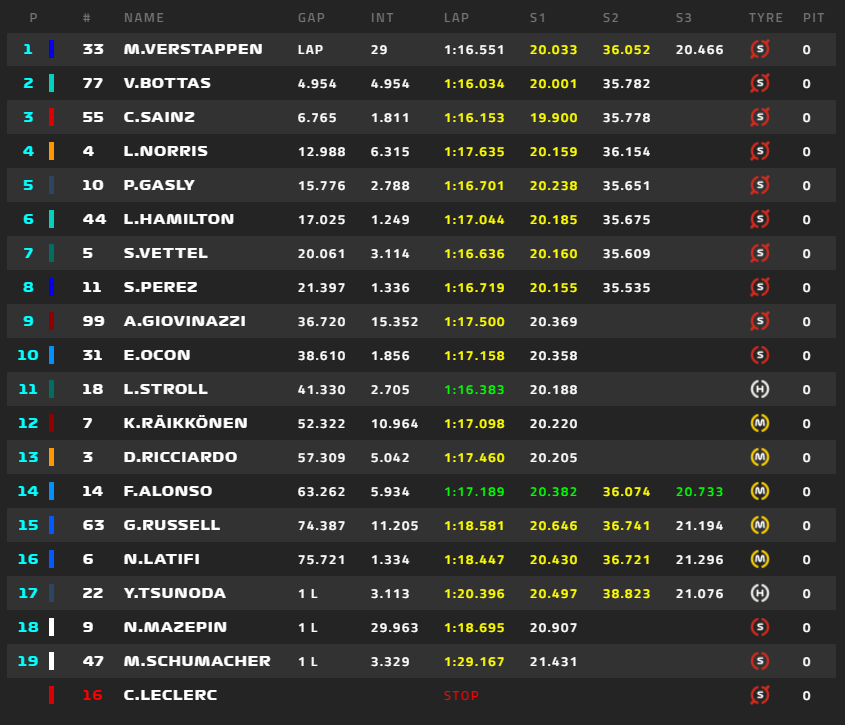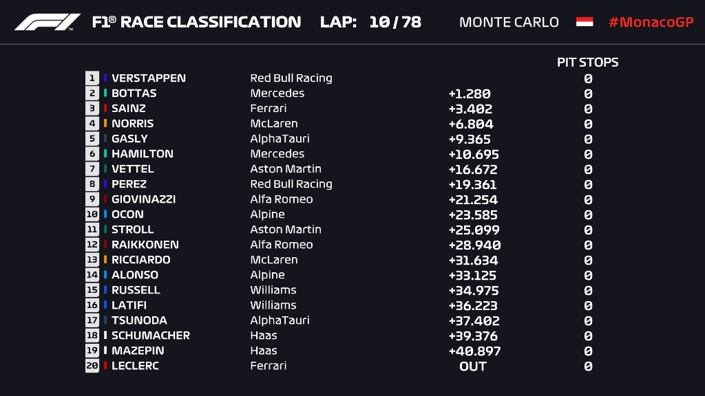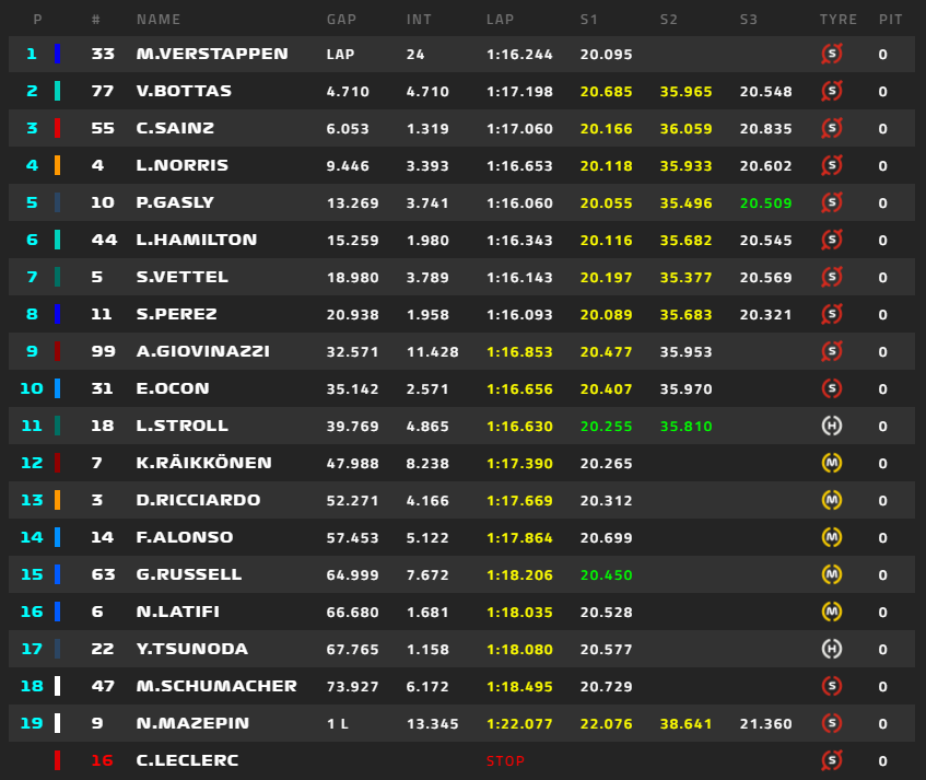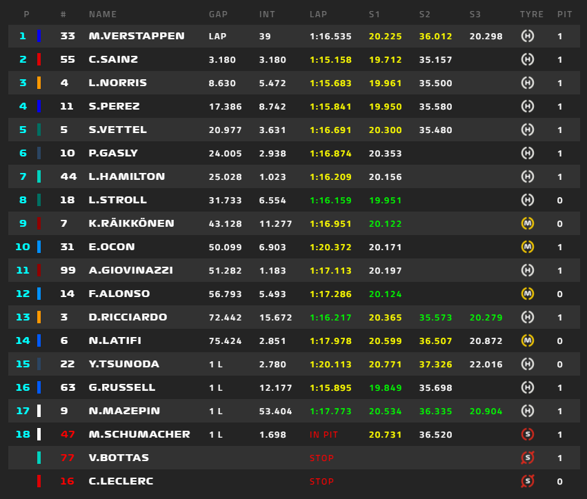 1位フェルスタッペン、2位ボタス、3位サインツ、4位ノリス、5位ガスリー、6位ハミルトン、角田裕毅は16位。