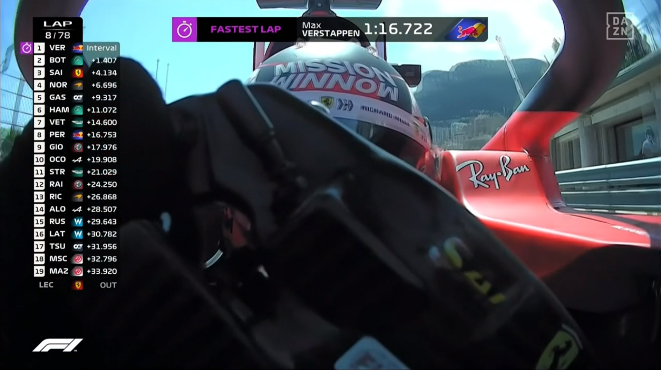 今、レコノサンス・ラップ時の映像が流れたが、ルクレールが「ギアか、何かがおかしい」と訴えて両手をヘルメットに、彼はこの時点で悟ったのかも。