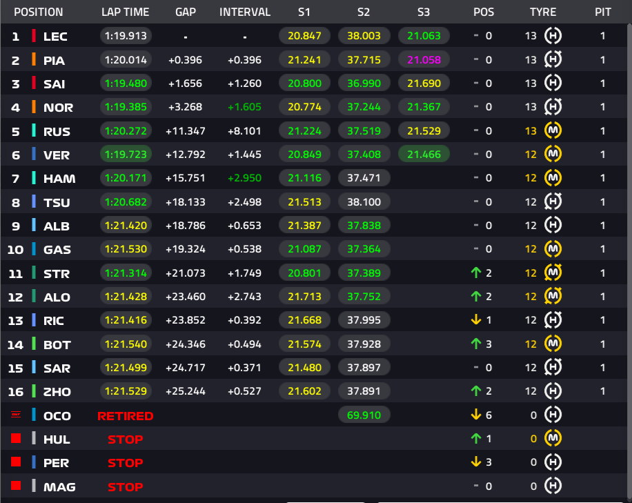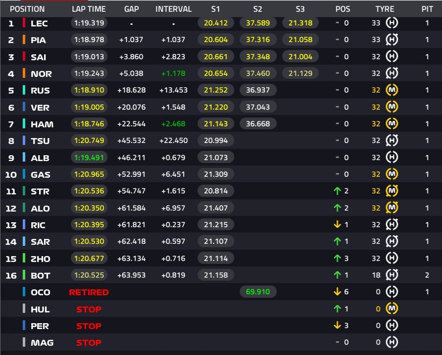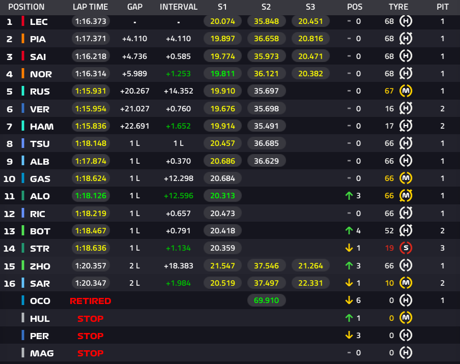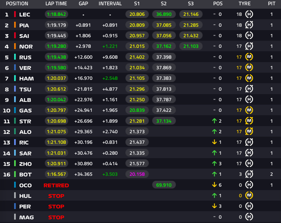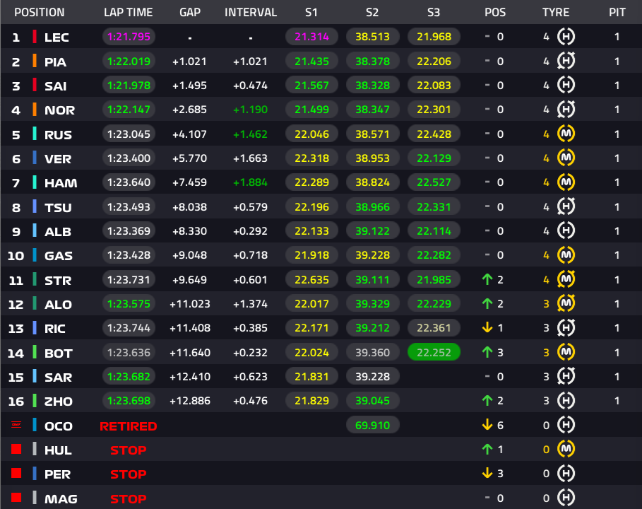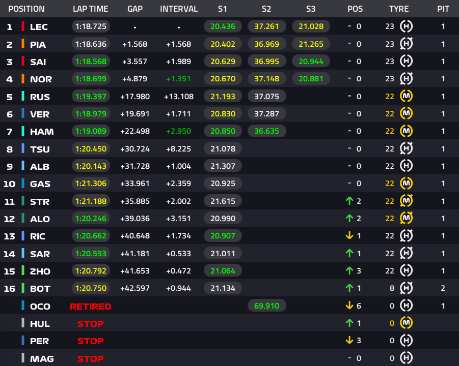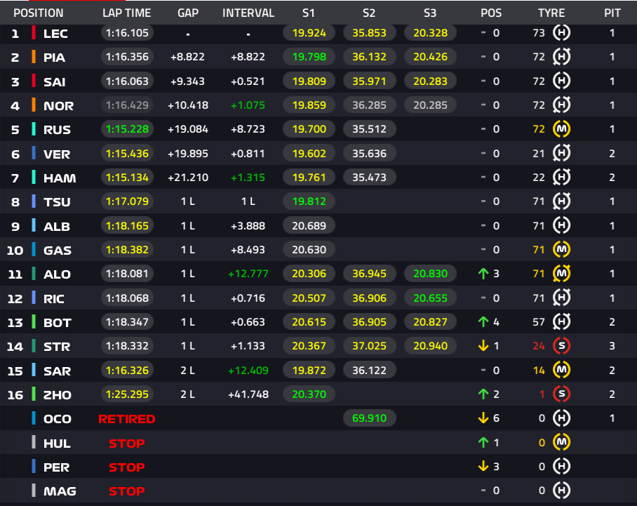 1位ルクレール、2位ピアストリ、3位サインツ、4位ノリス、5位ラッセル、6位フェルスタッペン、7位ハミルトン、8位角田裕毅、9位アルボン、10位ガスリー