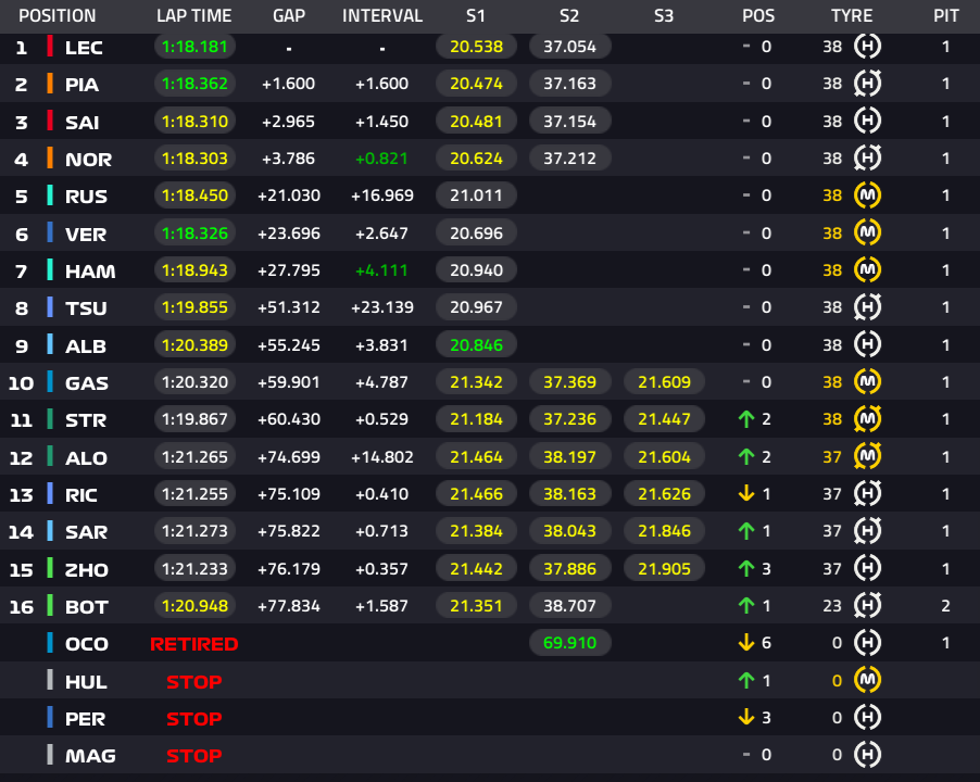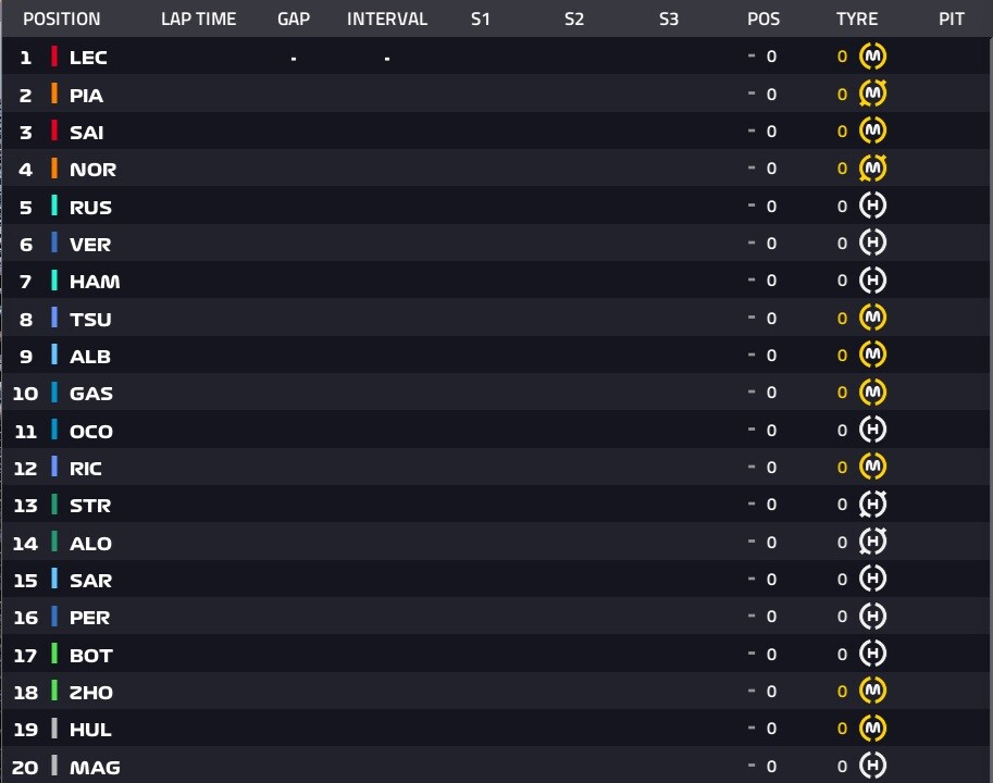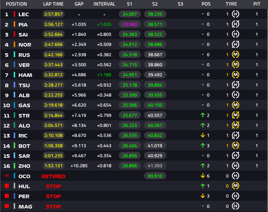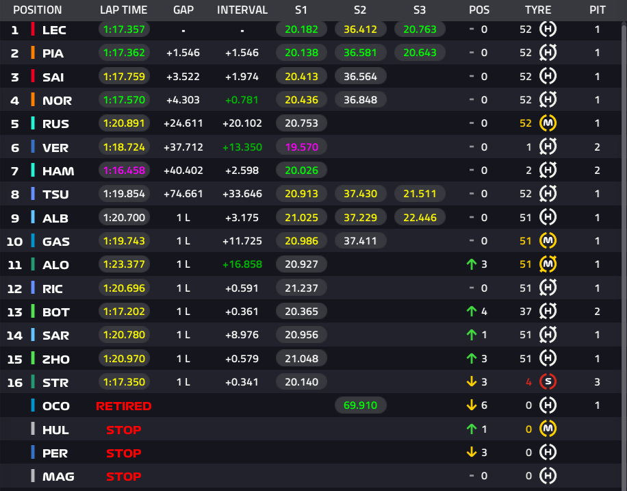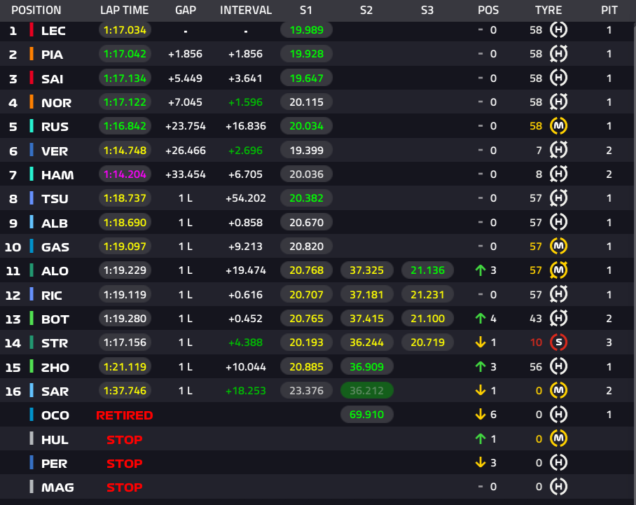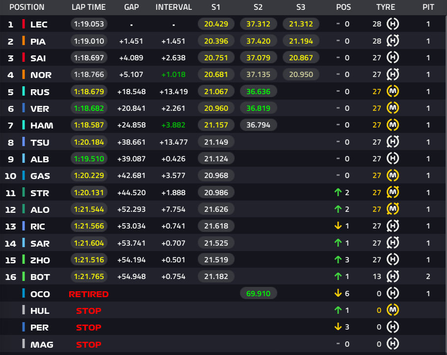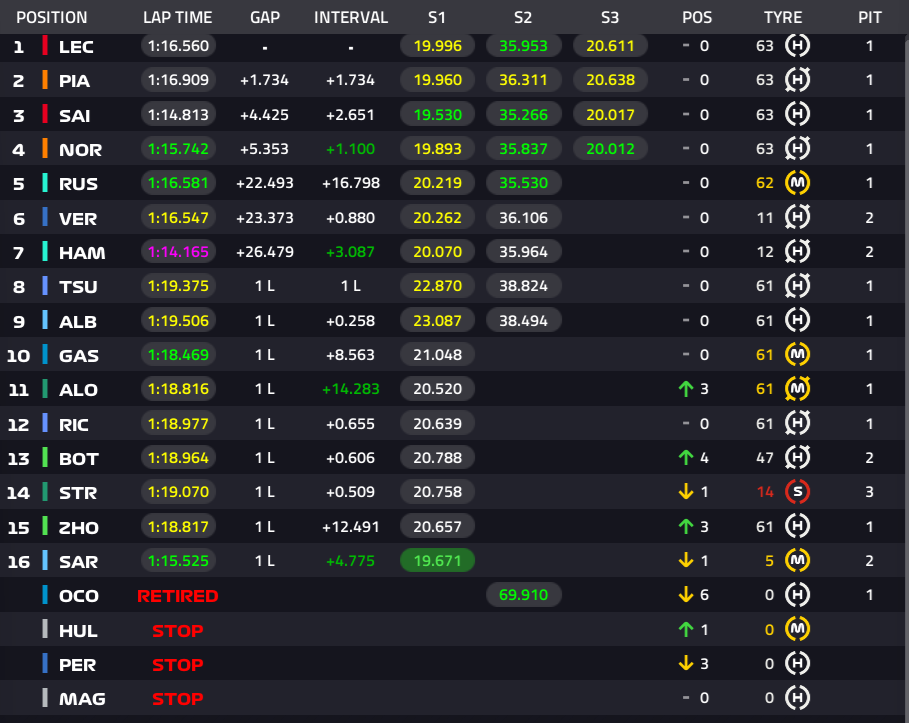 1位ルクレール、2位ピアストリ、3位サインツ、4位ノリス、5位ラッセル、6位フェルスタッペン、7位ハミルトン、8位角田裕毅、9位アルボン、10位ガスリー