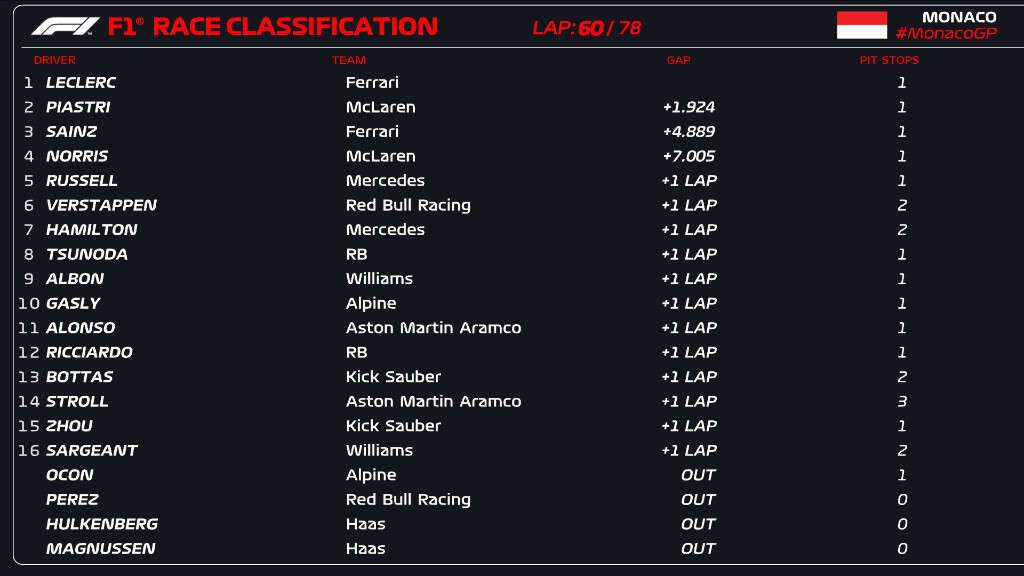 1位ルクレール、2位ピアストリ、3位サインツ、4位ノリス