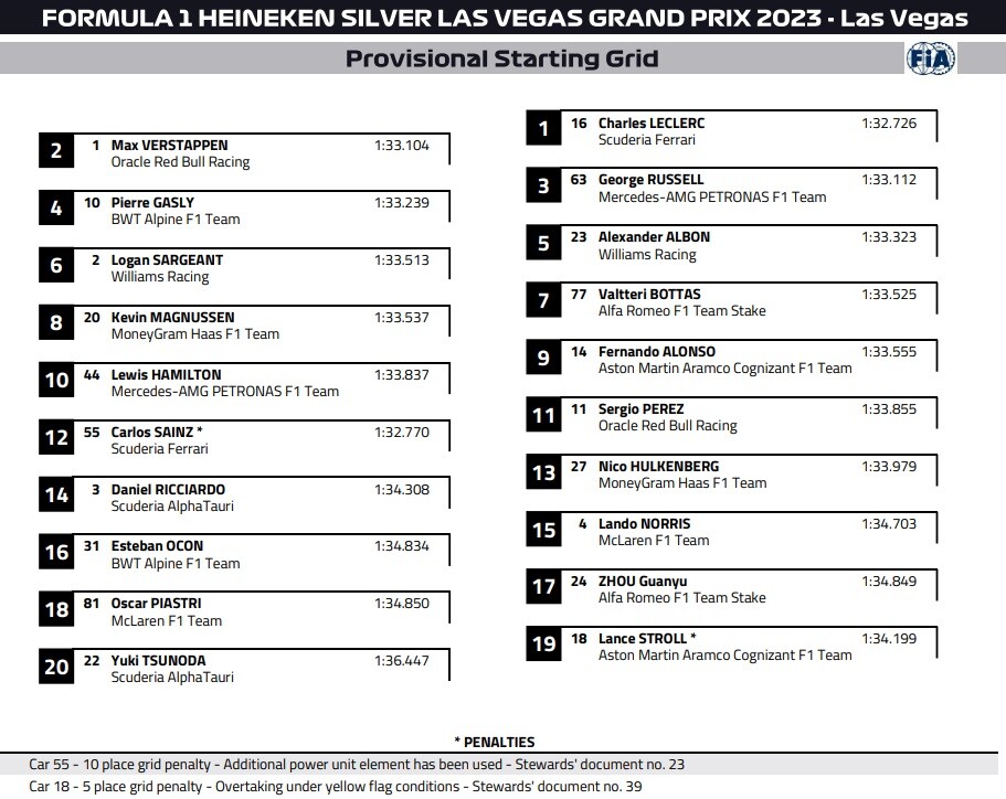 ランス・ストロールは、フリー走行3回目でダブルイエローフラッグが振られるゾーンでカルロス・サインツを追い抜いたため、グリッド5番降格ペナルティを科せられた。