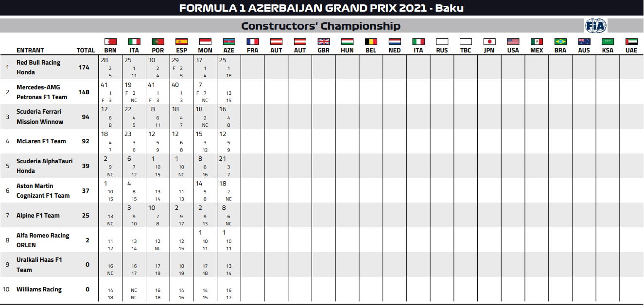 順位 得点 ドライバー (コンストラクター) 優勝回数